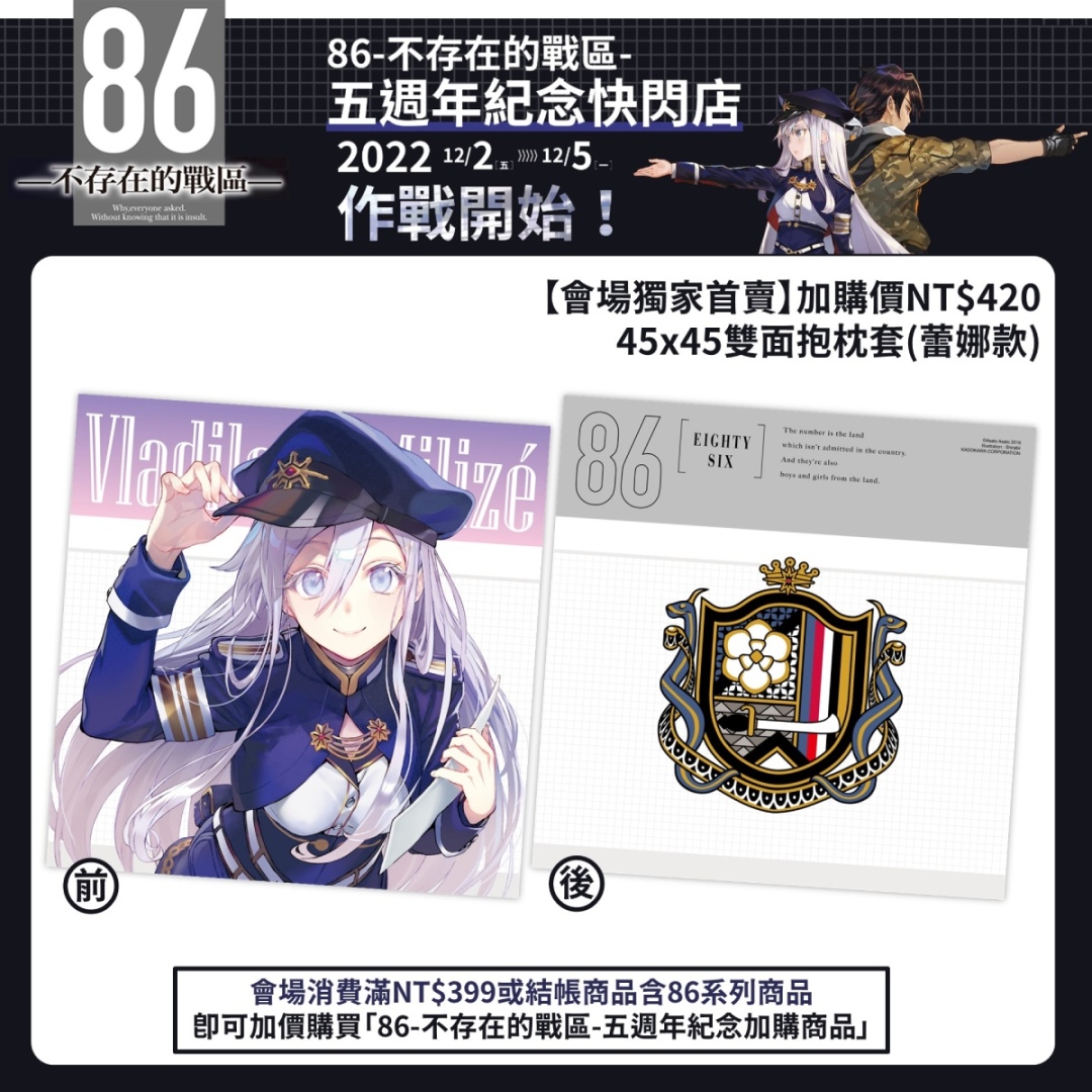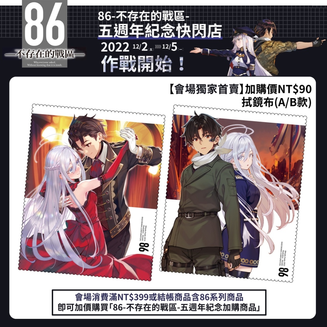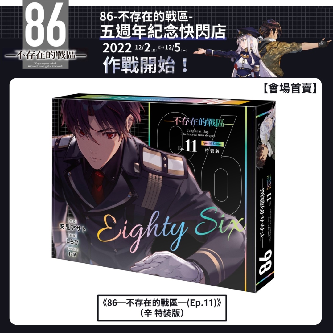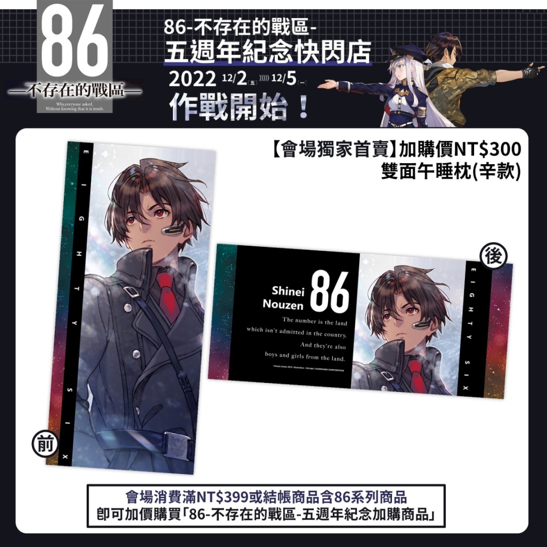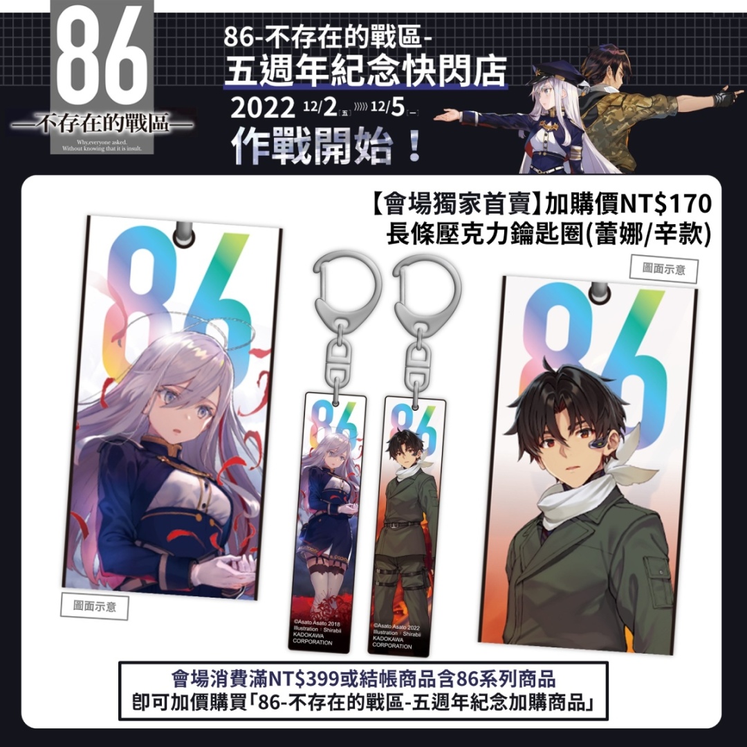 粉絲期待已久的新刊《86─不存在的戰區─ (Ep.11)》辛主題的特裝版&蕾娜主題的限定版,將在快閃店獨家首賣!會場也將同步推出多款「86 周邊加價購」,包括兩款收錄戰鬥部隊「先鋒」重要的夥伴們齊聚一堂名場面「電競滑鼠墊」、蕾娜與辛搭配了各自代表國徽圖像的「45x45 雙面抱枕套」共兩款,以及兩人分別遙望遠方的「雙面午睡枕」、初次會面的感動時刻「長條壓克力鑰匙圈」還有兩人珍貴共舞及甜蜜牽手的絕讚場景「拭鏡布」,凡於會場任意消費滿額 NT$399,或是結帳商品含《86》系列即可加價購買!會場獨家首賣商品皆為限量推出售完為止,意者敬請把握機會參加僅有四天的快閃店活動,以免向隅。