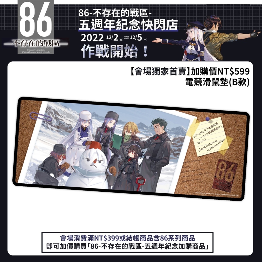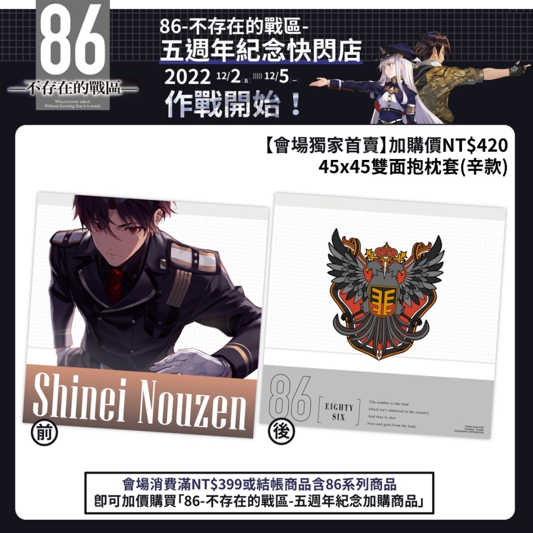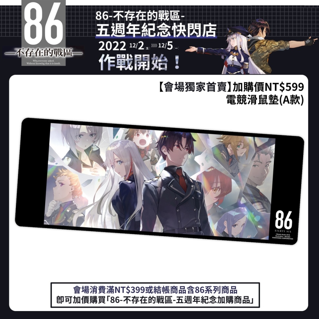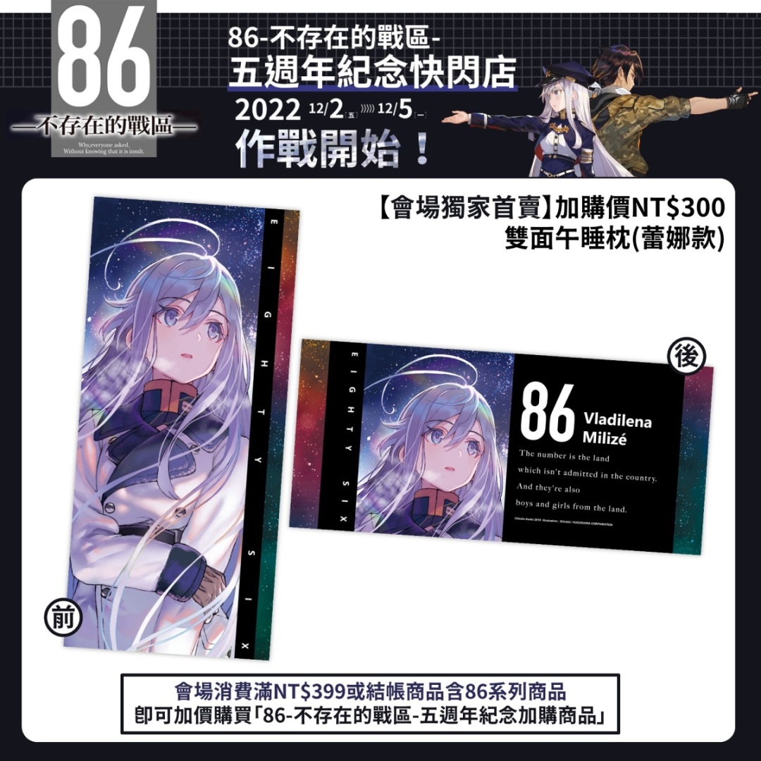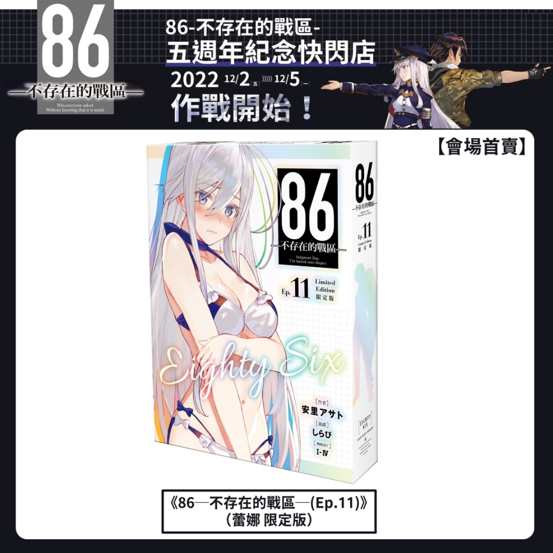 粉絲期待已久的新刊《86─不存在的戰區─ (Ep.11)》辛主題的特裝版&蕾娜主題的限定版,將在快閃店獨家首賣!會場也將同步推出多款「86 周邊加價購」,包括兩款收錄戰鬥部隊「先鋒」重要的夥伴們齊聚一堂名場面「電競滑鼠墊」、蕾娜與辛搭配了各自代表國徽圖像的「45x45 雙面抱枕套」共兩款,以及兩人分別遙望遠方的「雙面午睡枕」、初次會面的感動時刻「長條壓克力鑰匙圈」還有兩人珍貴共舞及甜蜜牽手的絕讚場景「拭鏡布」,凡於會場任意消費滿額 NT$399,或是結帳商品含《86》系列即可加價購買!會場獨家首賣商品皆為限量推出售完為止,意者敬請把握機會參加僅有四天的快閃店活動,以免向隅。