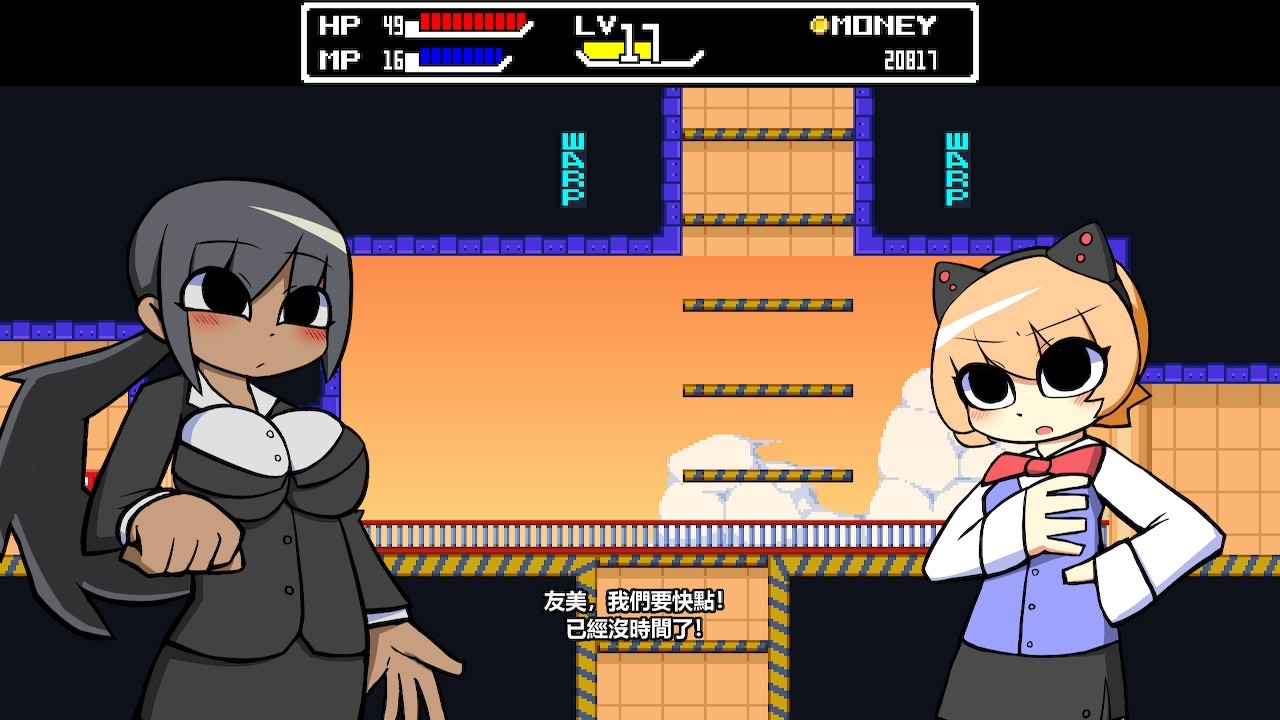 目前在遊戲裡,還有接近 20 種的強化道具登場。有些可以在店裡買到,有些則可以從頭目身上搶過來,當然在隱藏區域裡也有機會找到。每項裝備都能大幅強化友美的能力,取得所有裝備之後,移動的自由程度甚至能夠超越重力或物理法則!? 而遊戲內角色間的對話也十分有趣。包括和頭目對嗆、友美和莉可的閒聊,或是兩人的過去人生。隨著劇情發展,各種對話的內容等著玩家來發掘。