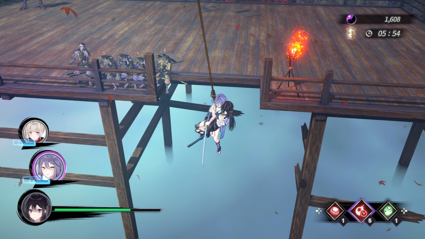 但特別注意「忍具」屬於消耗性道具,更只有「依夜」能夠使用,切換成其他女忍是完全無法使用的。「刃鋼」的鉤索只能用來跨越特殊地形跟道具,而狐美魅丟擲炸彈也是屬於環境道具利用。絕招「口憑術」則因為劇情限制要到後期才能習得,到時取得用來暫時強化主角能力,用來回頭農前面的關卡會比較輕鬆點。