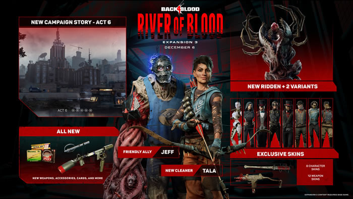 《Back 4 Blood 喋血復仇》為人氣作生存恐怖 FPS《Left 4 Dead 惡靈勢力》開發團隊所打造,主打協力合作玩法的殭屍生存第一人稱視點動作射擊 FPS 遊戲。而在這次的第三波大型改版「River of Blood」中,除了追加新的玩家角色「Tala」、新的「The Ridden 災變者」角色「Jeff」登場外,還有新的武器、新的敵人、新的外觀、新的卡牌等各式各樣的內容登場,讓玩家們可以透過這次的改版,體驗遊戲更加豐富刺激的對戰廝殺樂趣與挑戰!