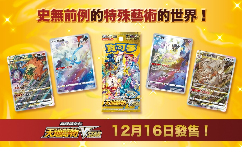 日本 Pokémon 推出、傑仕登在台灣代理發行繁體中文版的《寶可夢》實體卡牌遊戲《寶可夢集換式卡牌遊戲》,宣布將自 12 月 16 日起,推出最新一波高級擴充包「天地萬物 VSTAR」讓玩家們選購,定價 159 元新台幣。