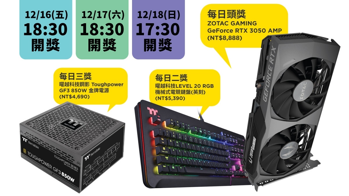 .每日特獎(獎品包含 Zotac Gaming GeForce RTX 3050 AMP 顯示卡、曜越科技精選特獎、及 Zotac 限量周邊…等大獎)