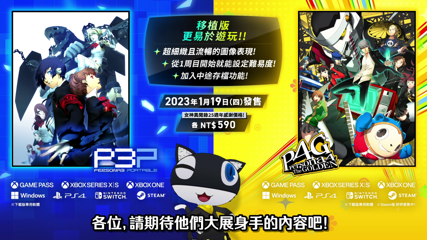 SEGA 宣布,由 ATLUS 所開發的移植版《女神異聞錄3 攜帶版》與《女神異聞錄4 黃金版》(Xbox Game Pass/Xbox Series S|X/Xbox One/Windows/PS4/Nintendo Switch/Steam)預定於 2023 年 1 月 19 日發售,自今(16)日起開放預購&登錄至願望清單。
