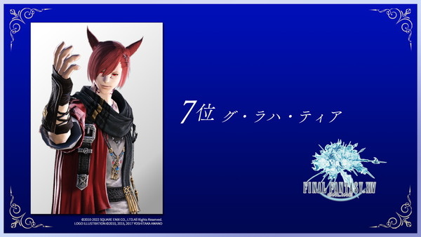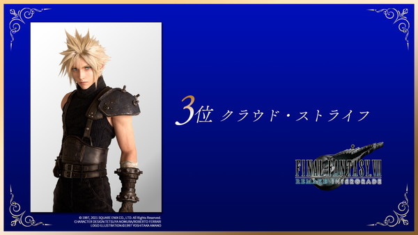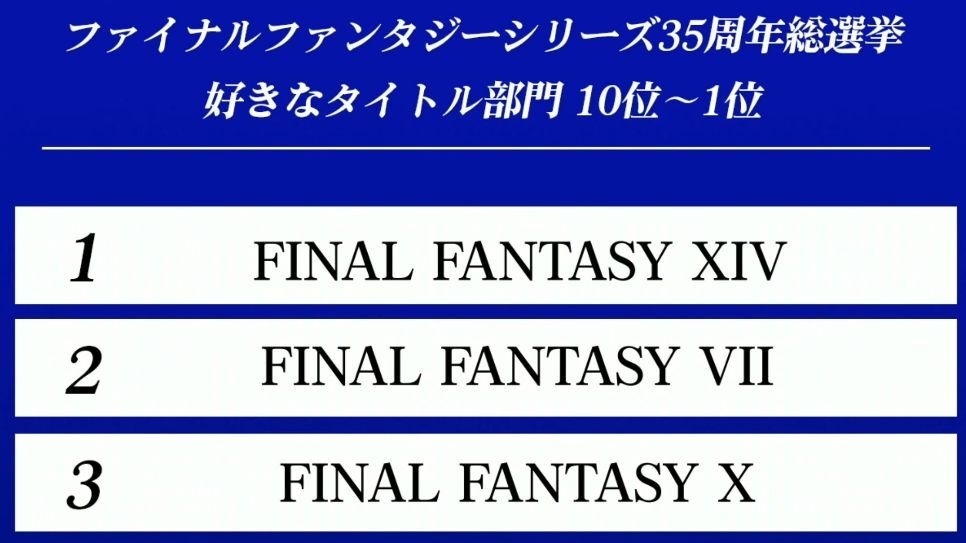 該投票分成「作品部門」、「樂曲部門」和「角色部門」三個項目,作品部門由歷經浴火重生,營運至今快十個年頭,獲得全球玩家一致熱愛的《Final Fantasy XIV》(FF14)拿下冠軍,緊接的亞軍和季軍分別是《Final Fantasy VII》(FF7,含FF7R)與《Final Fantasy X》(FF10,含FF10-2)。
