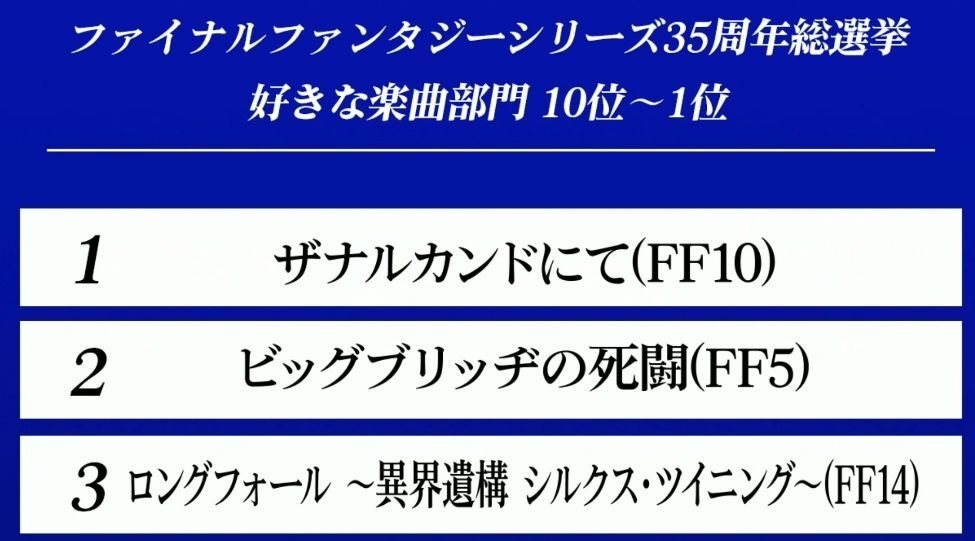 樂曲部門由 2019 年得到 NHK「全《Final Fantasy》大投票」活動中榮獲第一名的《FF10》抒情名曲「ザナルカンドにて」拔得頭籌,第二名是《FF5》的戰鬥名曲「ビッグブリッヂの死闘」,第三名則是《FF14》當中登場的副本曲「ロングフォール ~異界遺構 シルクス・ツイニング~」。