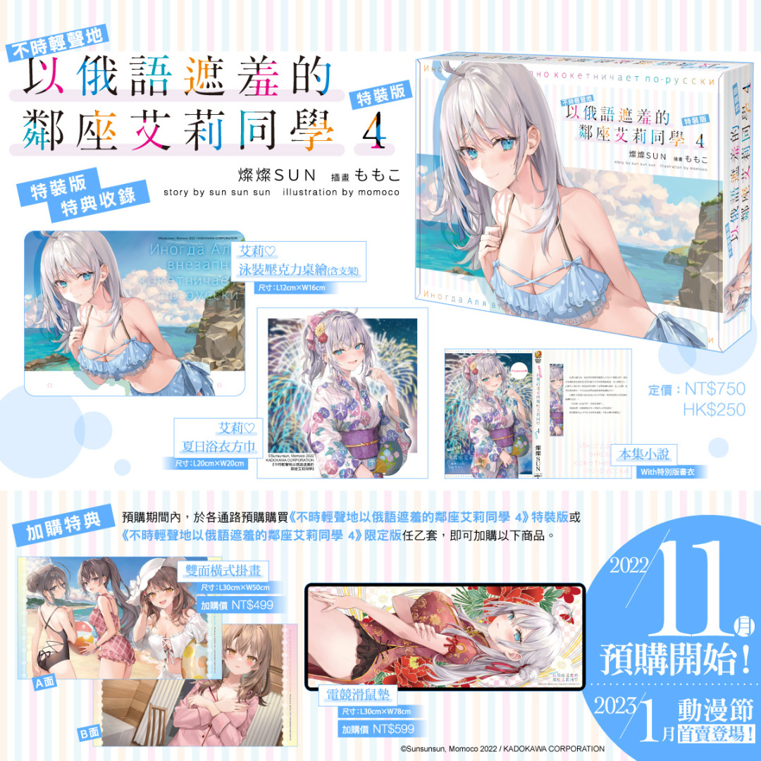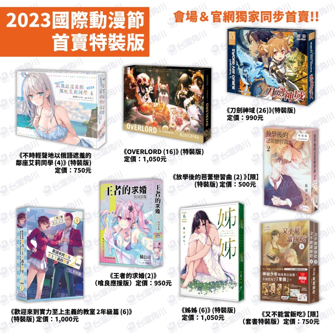 2023 台北國際動漫節將在明年一月底隆重登場!台灣角川今日公開完整首賣書單情報,首先關注焦點為兩款限定版、八款特裝版新刊:《不時輕聲地以俄語遮羞的鄰座艾莉同學 (4)》及《歡迎來到實力至上主義的教室 2年生篇 (6)》同步推出限定與特裝雙版本;劇場版在台票房破三千萬的現象級輕小說《Sword Art Online 刀劍神域 (26)》,粉絲期待已久終於迎來續刊的《OVERLORD (16)》與《姊姊 (6)》,橘公司老師與つなこ老師再次攜手推出最新力作續篇《王者的求婚 (2)》,以及超人氣 BL 漫畫《放學後的芭蕾戀習曲 (2)》。「KadoKado 角角者」獨家連載 BL 小說《又不能當飯吃》也將同步推出特裝版及單行本於動漫節首賣!於官網預購登記或在會場購買書籍兌換資格券,即可參加 2023 台北國際動漫節「吐維老師簽名會」。更多活動情報與相關書訊,請至台灣角川官網查詢。