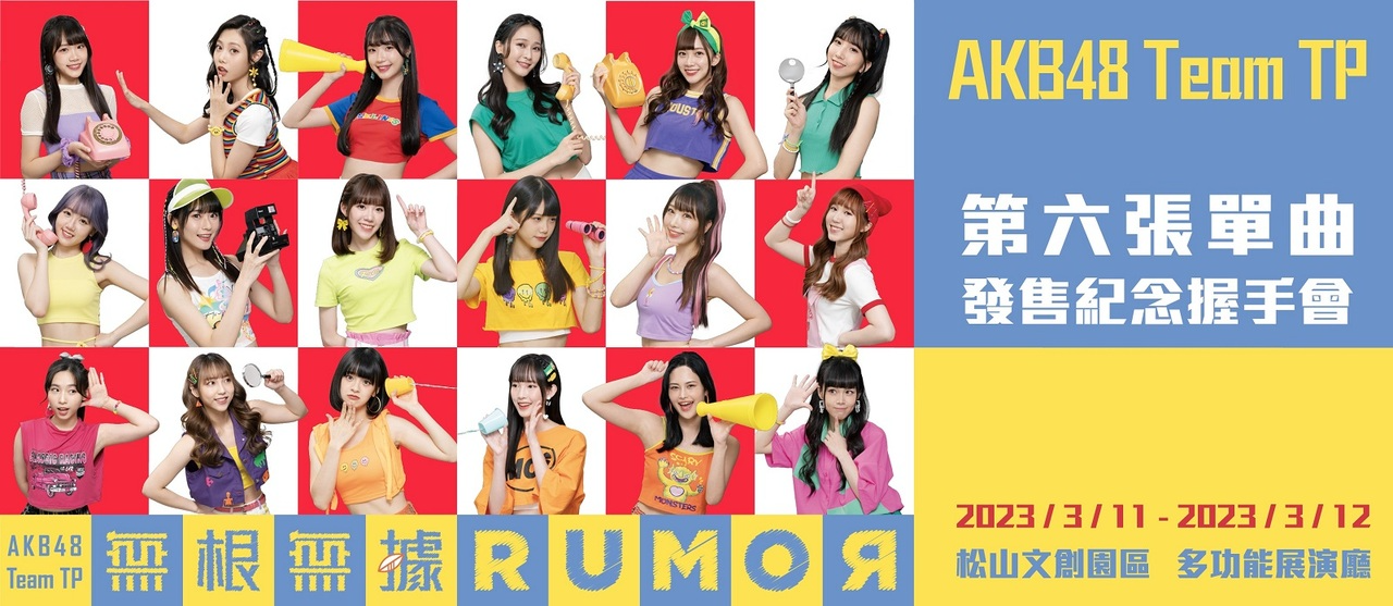 AKB48 是由知名作詞家秋元康擔任總製作人,在 2005 年創立以「可以面對面的偶像」為理念,以充滿活力與青春熱情,帶來令粉絲難忘的演出的人氣日本音樂團體。而「AKB48 Team TP」作為姊妹團成立於 2018 年至今,更在 2022 年 10 月推出最新第六單《無根無據RUMOR》,並連續兩個月蟬聯 CD 暢銷排行榜冠軍,為感謝粉絲熱情支持,預計將在 2023 年 3 月 11、12 日舉辦發售紀念握手會。