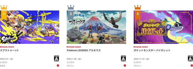 讓眾多玩家期待已久的《斯普拉遁 3》在發售後好評不斷,更創下各種紀錄與話題,發售首三天就突破 345 萬套,僅次於《寶可夢 朱/紫》的 405 萬套,發售後更頻繁的推出節日與賽季活動熱度持續不減;第二、三、四名皆由《寶可夢》系列作品拿下,《寶可夢傳說 阿爾宙斯》延續上半年第一的氣勢位居第二,發售滿一個多月的《寶可夢 朱/紫》則是「紫」的排名勝過「朱」。