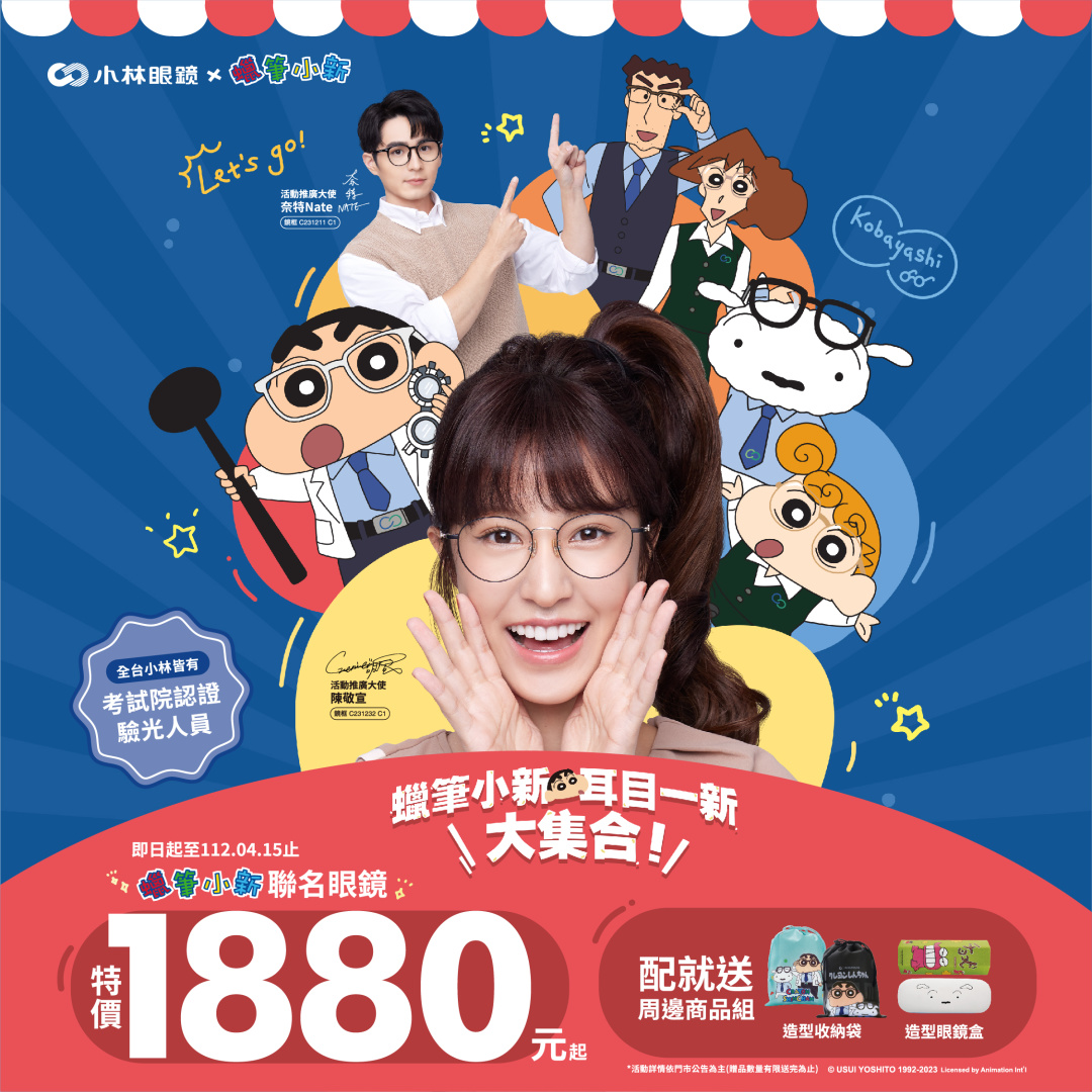 日本人氣動畫《蠟筆小新》首次與知名眼鏡連鎖品牌 KOBAYASHI 小林眼鏡推出多款設計豐富的聯名鏡架,這也是《蠟筆小新》IP 全球首度與眼鏡推出聯名商品。此次聯名依照角色與鏡框材質共分為「低調な新醬(低調的小新)」與「精緻な新醬(精緻的小新)」兩大系列,將《蠟筆小新》中的野原一家、動感超人、肥嘟嘟左衛門等經典角色融入鏡架與鼻墊的設計,形象海報中更是讓野原一家化身為專業的驗光人員,與小林攜手為大家提供最專業的技術與服務。同時邀請藝人陳敬宣擔任推廣大使,號召大家跟著小林眼鏡與蠟筆小新一起耳目一新大集合!1/6~4/15 期間,《蠟筆小新》聯名眼鏡只要 NT$1,880 元起,購買就送精美聯名週邊商品組,數量有限,送完為止。