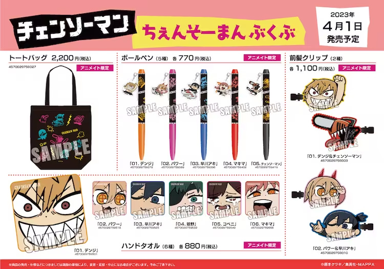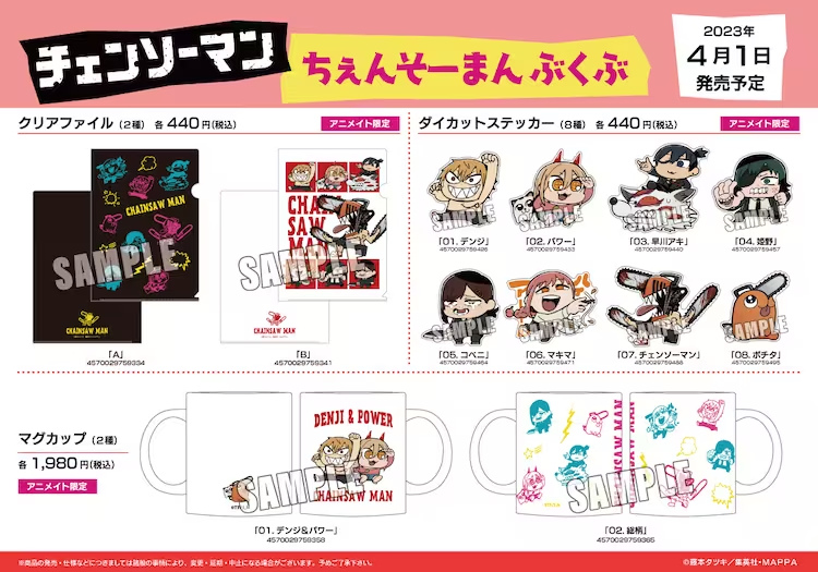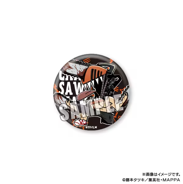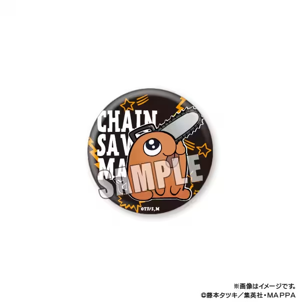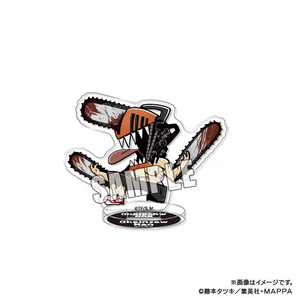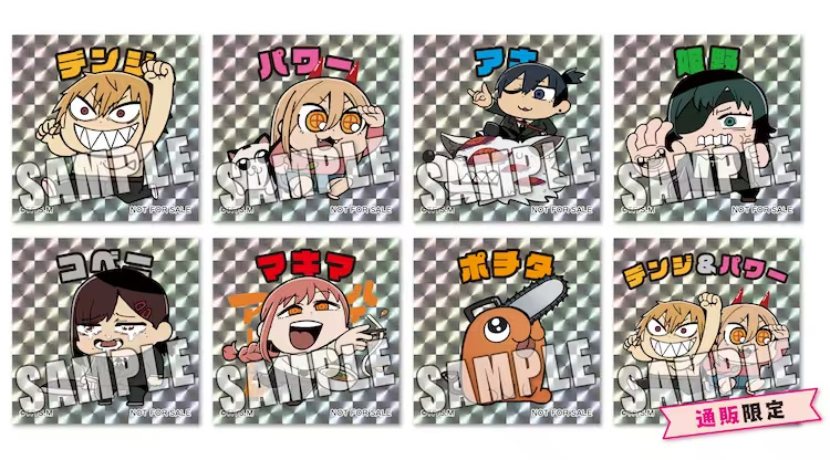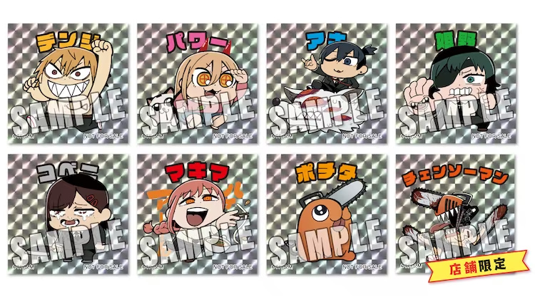 這次將會發行由大川ぶくぶ繪製《鏈鋸人》插圖的新週邊商品,預計有壓克力立牌、圓徽章、馬克杯及瀏海髮夾等,而購買系列週邊滿額 2200 日圓的客人將可以隨機獲得一款雷射貼紙(共八款)。