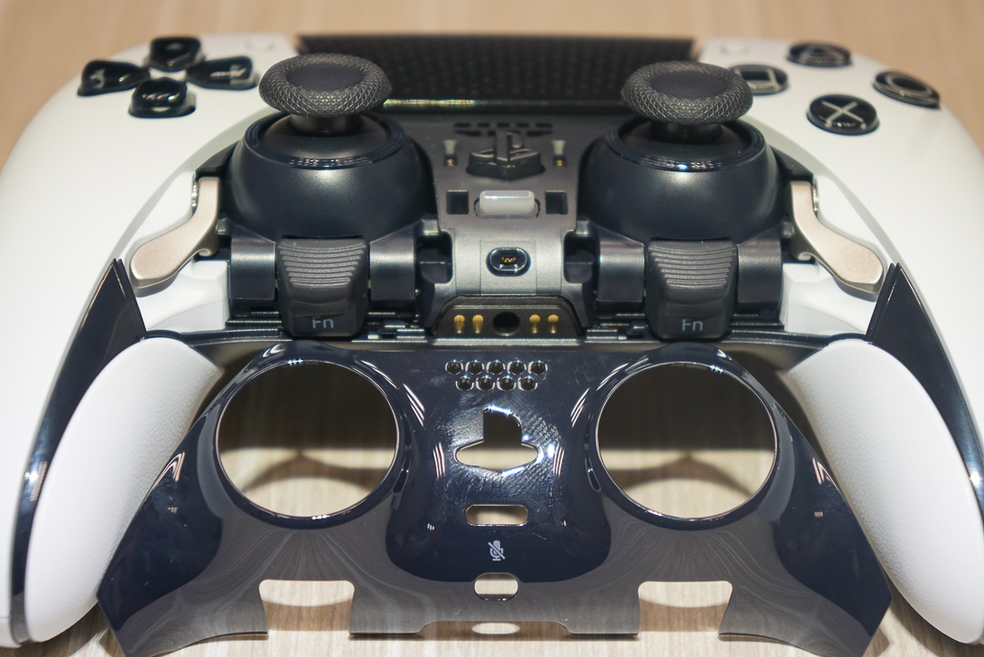 DualSense Edge 外觀輪廓與 DualSense 控制器幾乎一致,但重量在手感上並未感覺到差異顯著,但是觸控版改為黑色,而且一樣給予了跟搖桿外緣相同的經典 PlayStation 符號設計,兩個操作桿位置的上蓋可以很輕鬆的取下,方便後期更換調整的部份,透過可替換的控制桿,可解決當漂移產生後必須換掉整隻控制器的尷尬情境。