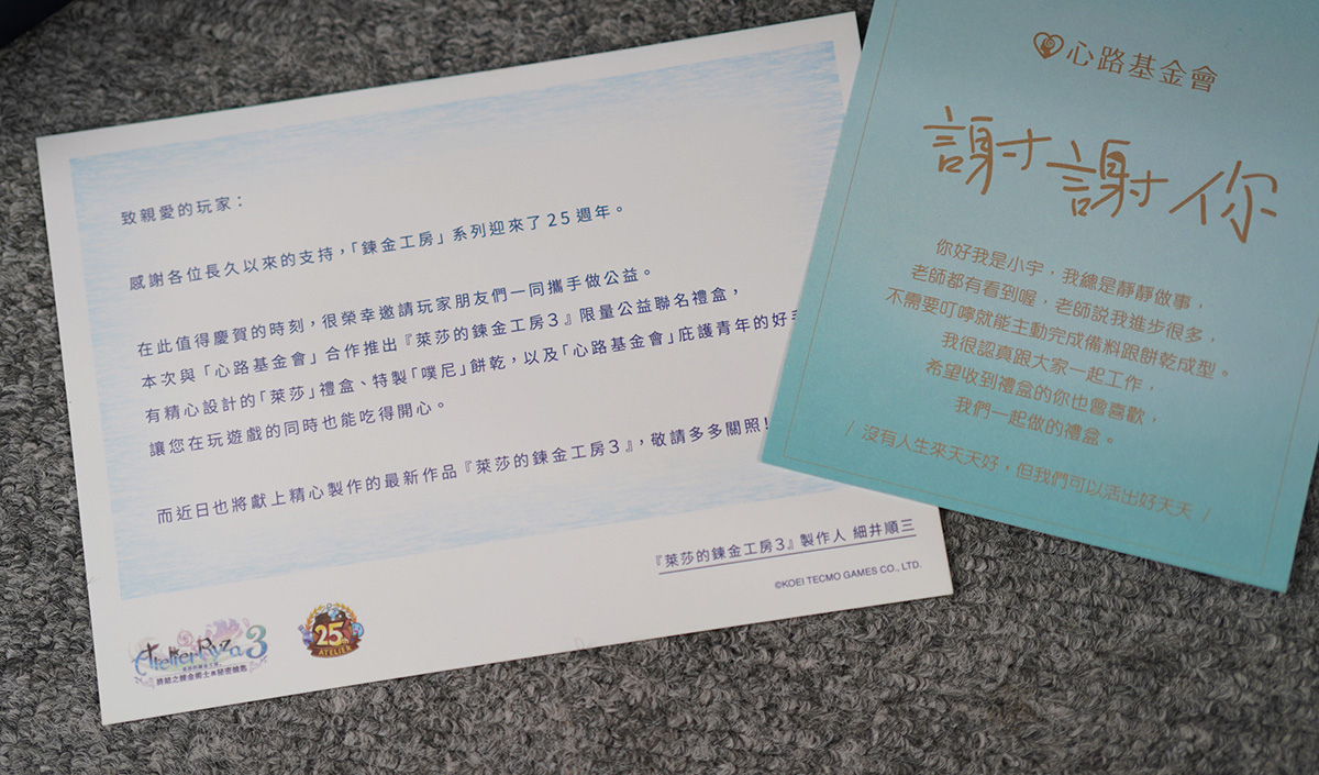 『萊莎的鍊金工房3』與「財團法人心路社會福利基金會」攜手合作推出限量聯名公益餅乾禮盒,今日首度亮相。除了精心設計的「萊莎」外盒之外、內含「噗尼造型」手工餅乾、亞洲限定「萊莎」胸章相框等,將於近日推出義賣。
