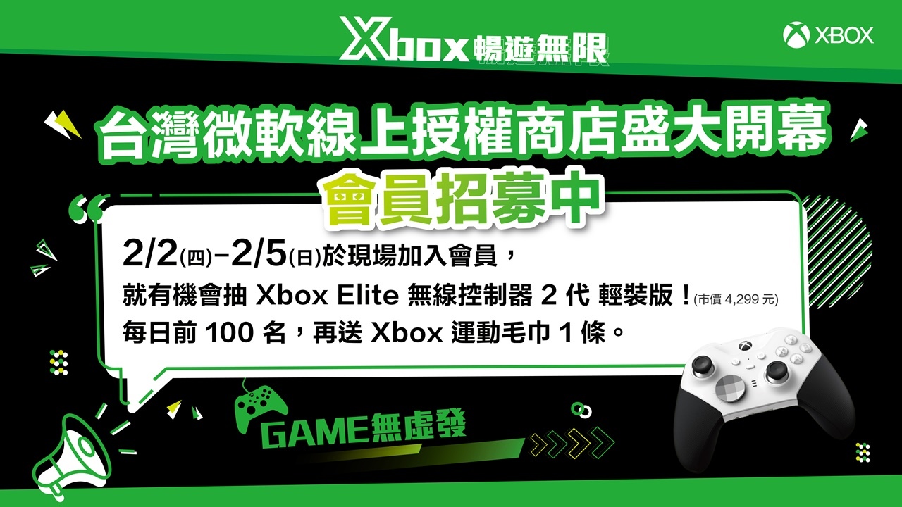 微軟線上授權商店於即日起正式為台灣使用者提供服務,販售微軟旗下 Xbox、Surface 及 PC 周邊配備等多樣產品。在台北國際電玩展 Xbox 攤位現場註冊成為台灣微軟線上授權商店的會員,即可獲得Xbox Elite 無線控制器 Series 2 輕裝版的抽獎機會,每日前 100 名註冊者更可直接獲得 Xbox 限量運動毛巾一條!更多優惠內容如下: