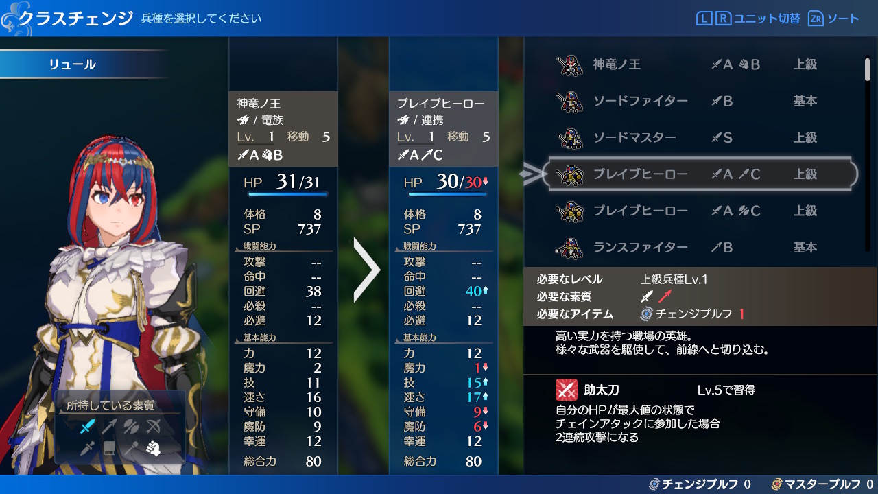 至於轉職培育方面,除了有兩格繼承特技可以自由選配從紋章士身上繼承來的技能外,自由度不是非常高,特別是兵種技能僅能保留現有兵種的技能,所以除了想要補強特定能力值外,並沒有什麼必要多轉幾種職業。但另一方面因為強調武器生剋的關係,所以許多基礎兵種就有多種不同武器,高級兵種更是有很多能同時運用兩種武器的兵種存在,讓玩家必須要更仔細構思自己的軍團陣容。