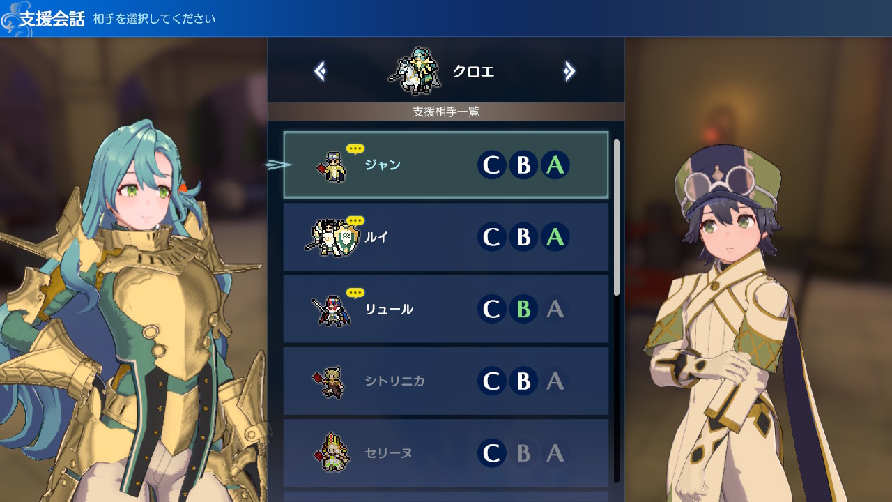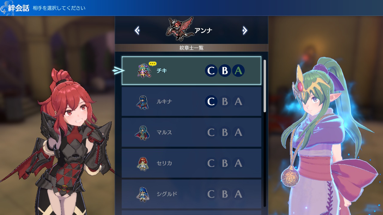 首先本作分為角色和角色之間的「支援對話」,以及角色與紋章士之間的「牽絆對話」。牽絆對話因為系統限制,所以每一個紋章士和每一個角色都必須要有完整三階段的對話。