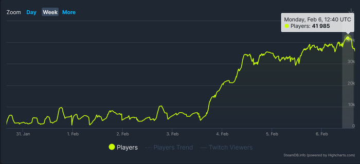 根據非官方數據庫網站「SteamDB」上的資料顯示,最近同時在線的玩家數量大約落在一萬人上下,然而自 2 月 4 日起突然暴增,最高來到超過四萬名玩家,接近遊戲剛上市期間的最高點(五萬六千人)。