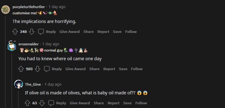 雖然帶來了一些有點黑暗的恐怖想像,但多數玩家喜愛的還是用迷你芙的油貼紙代表橄欖油的點子,除了可愛之外又附帶能直接聯想的效果,對許多喜愛料理和寶可夢的玩家來說是個絕佳商品,甚至還希望能有更多類似的創作讓人使用。