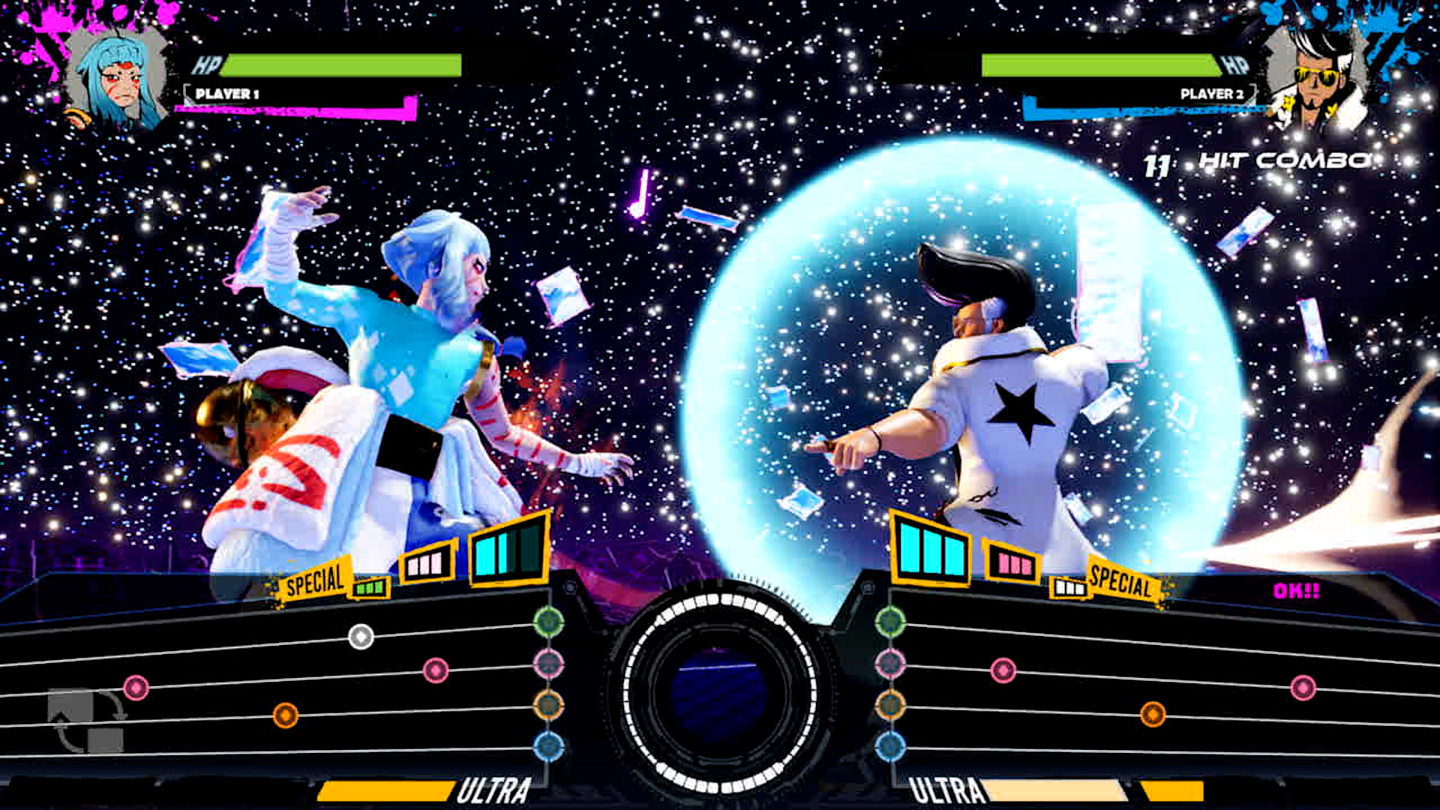 當你按下音符,你的能量槽也會隨之增加。在歌曲播放任何時間輸入指令(例如 ↓ → + RB)即可利用能量槽攻擊對手。你可以使用EX 招式給對手造成傷害、為對手增加更多音符,或使用減益效果削弱對手等。