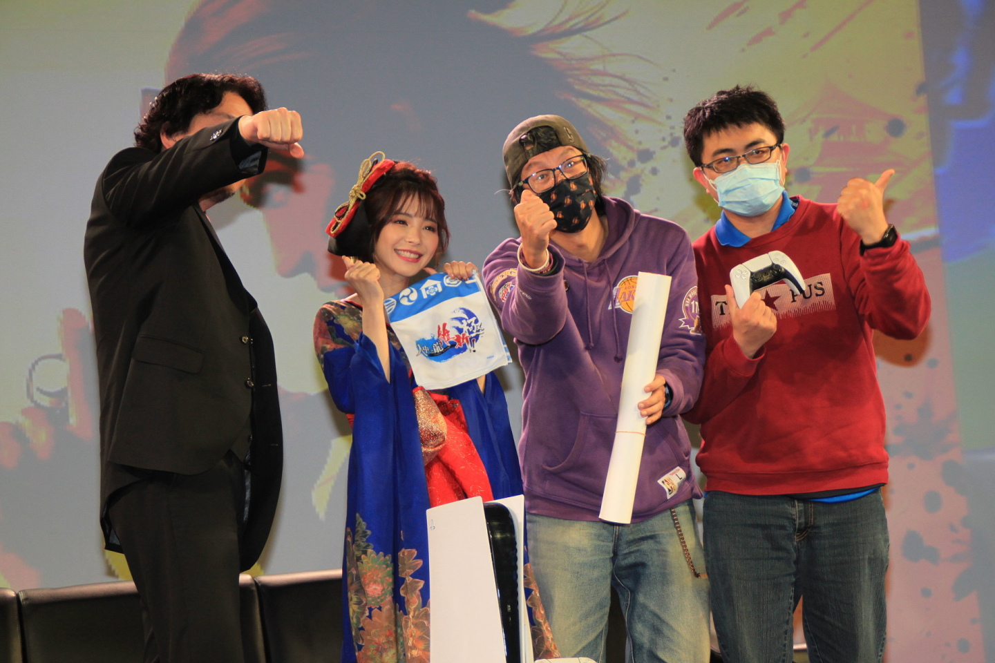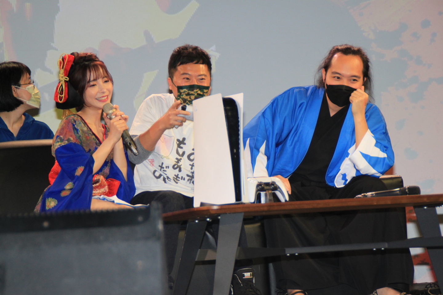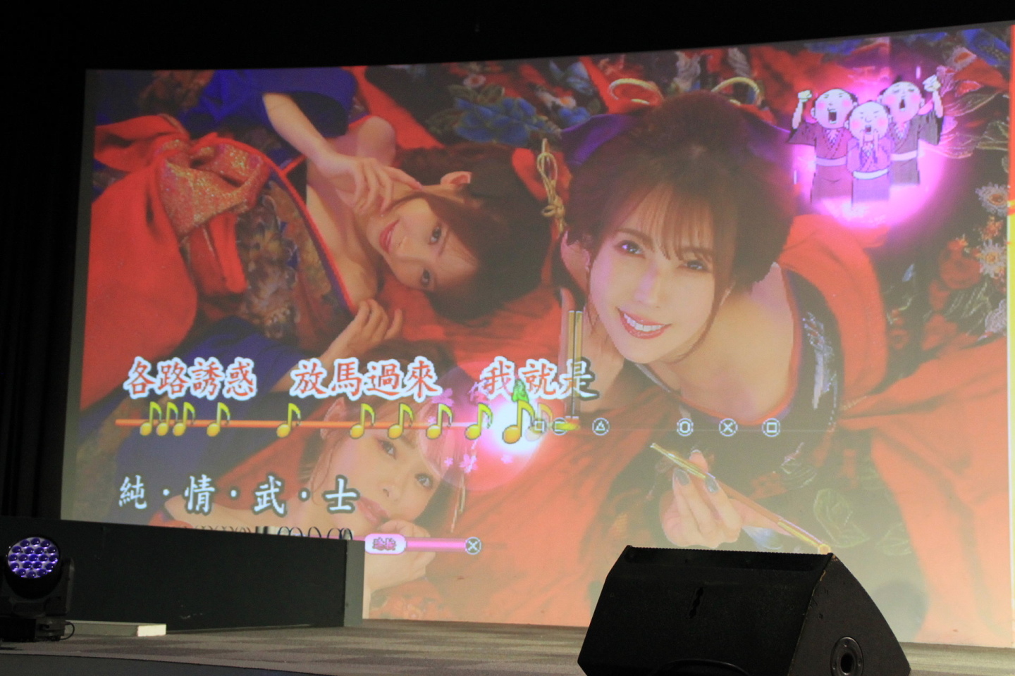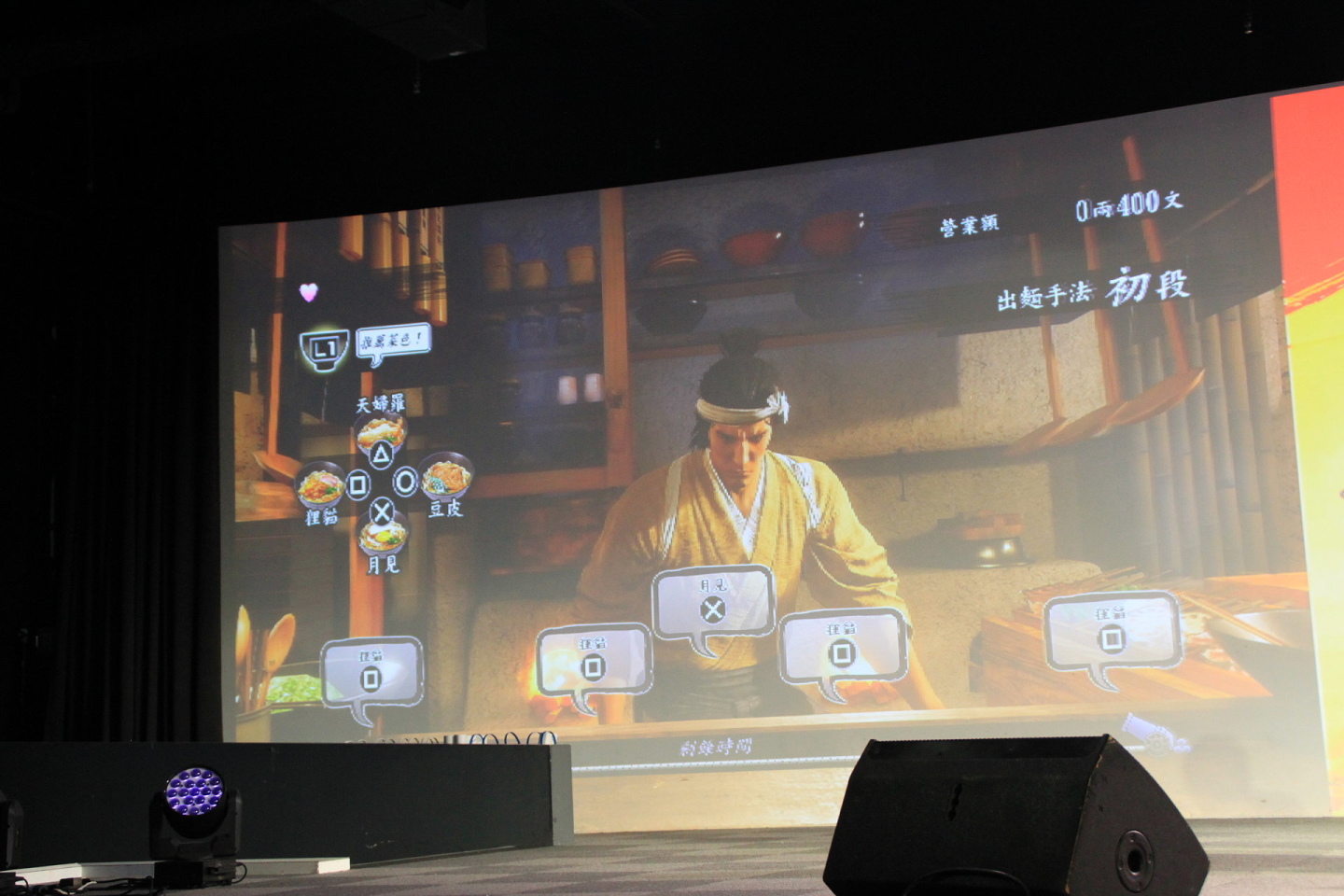 接下來,製作人與桃乃木小姐也邀請玩家上台一起遊玩遊戲同樂。本次官方與玩家互動的遊戲,包括「烏龍麵的幫忙」與「卡拉 OK」的挑戰,尤其卡拉 OK 的挑戰曲目又是由桃乃木小姐參與演出的「純情武士」,更是吸引許多玩家舉手參與爭取上台同樂的機會。尤其玩家中,更有人專門 cos 新選組劍士的造型,並有玩家在舞台上向桃乃木小姐表白「最喜歡桃乃木小姐」,也讓阪本製作人與桃乃木小姐非常開心。