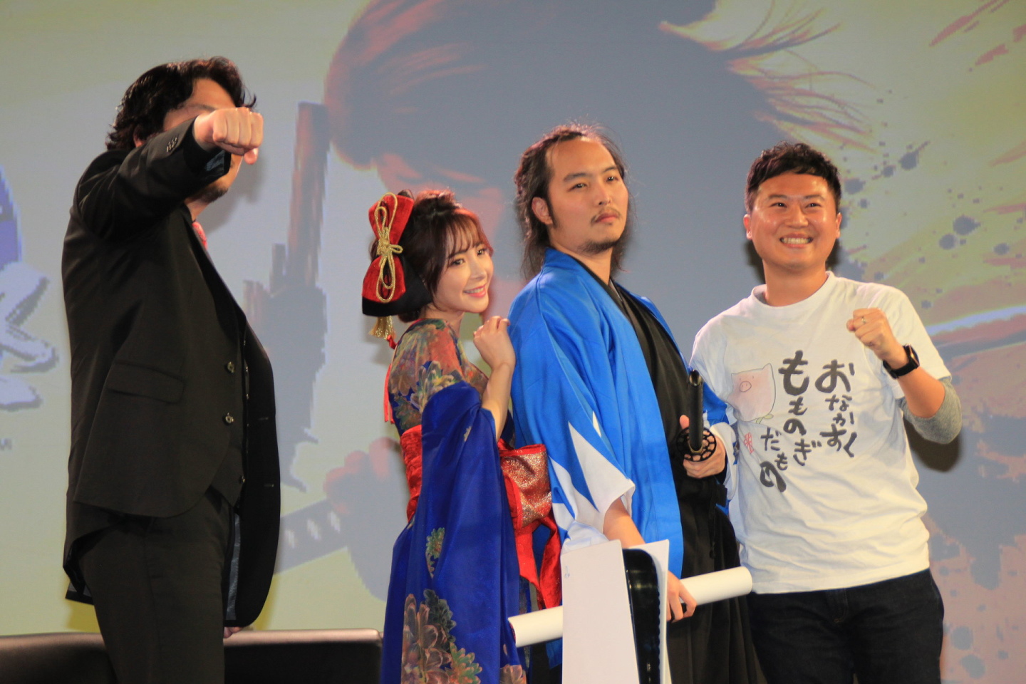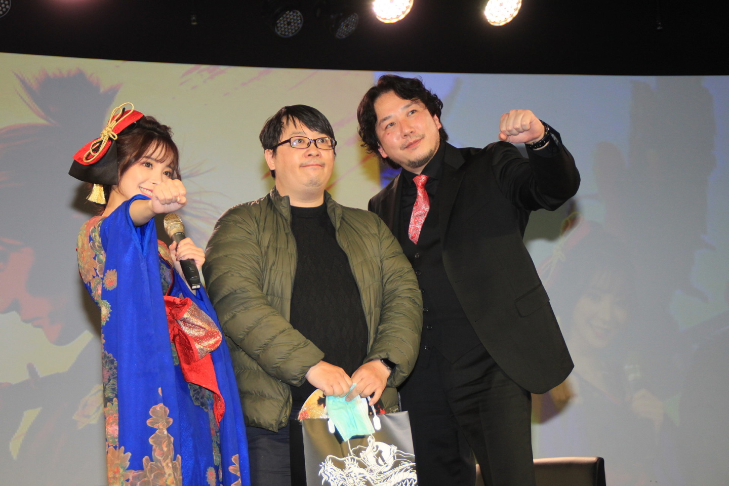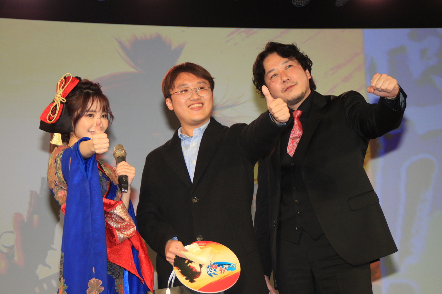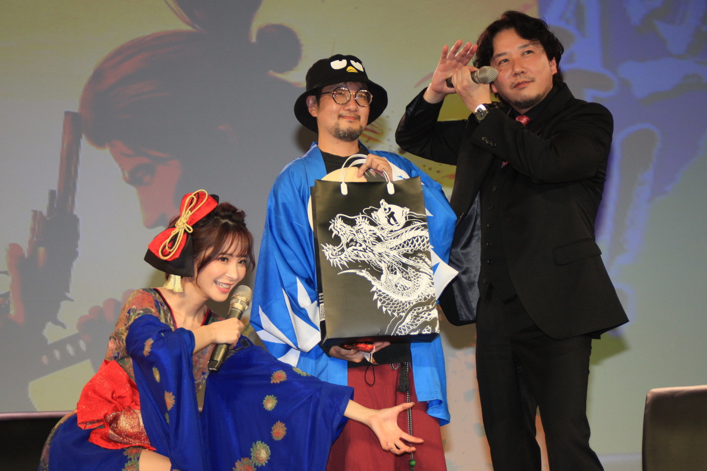 接下來,製作人與桃乃木小姐也邀請玩家上台一起遊玩遊戲同樂。本次官方與玩家互動的遊戲,包括「烏龍麵的幫忙」與「卡拉 OK」的挑戰,尤其卡拉 OK 的挑戰曲目又是由桃乃木小姐參與演出的「純情武士」,更是吸引許多玩家舉手參與爭取上台同樂的機會。尤其玩家中,更有人專門 cos 新選組劍士的造型,並有玩家在舞台上向桃乃木小姐表白「最喜歡桃乃木小姐」,也讓阪本製作人與桃乃木小姐非常開心。