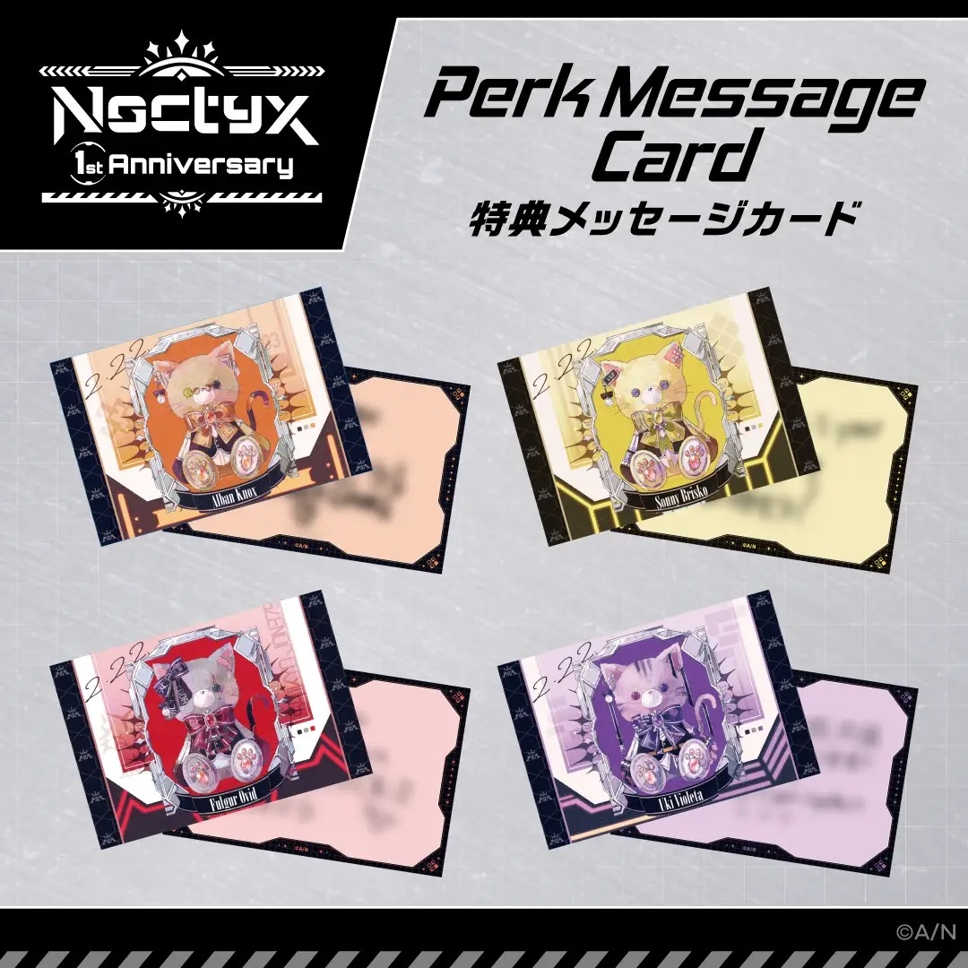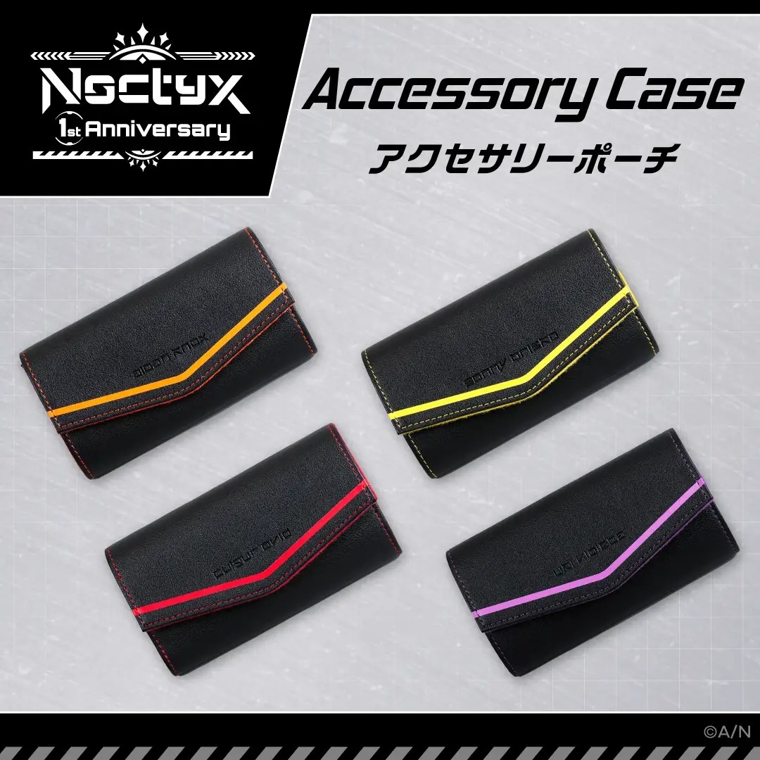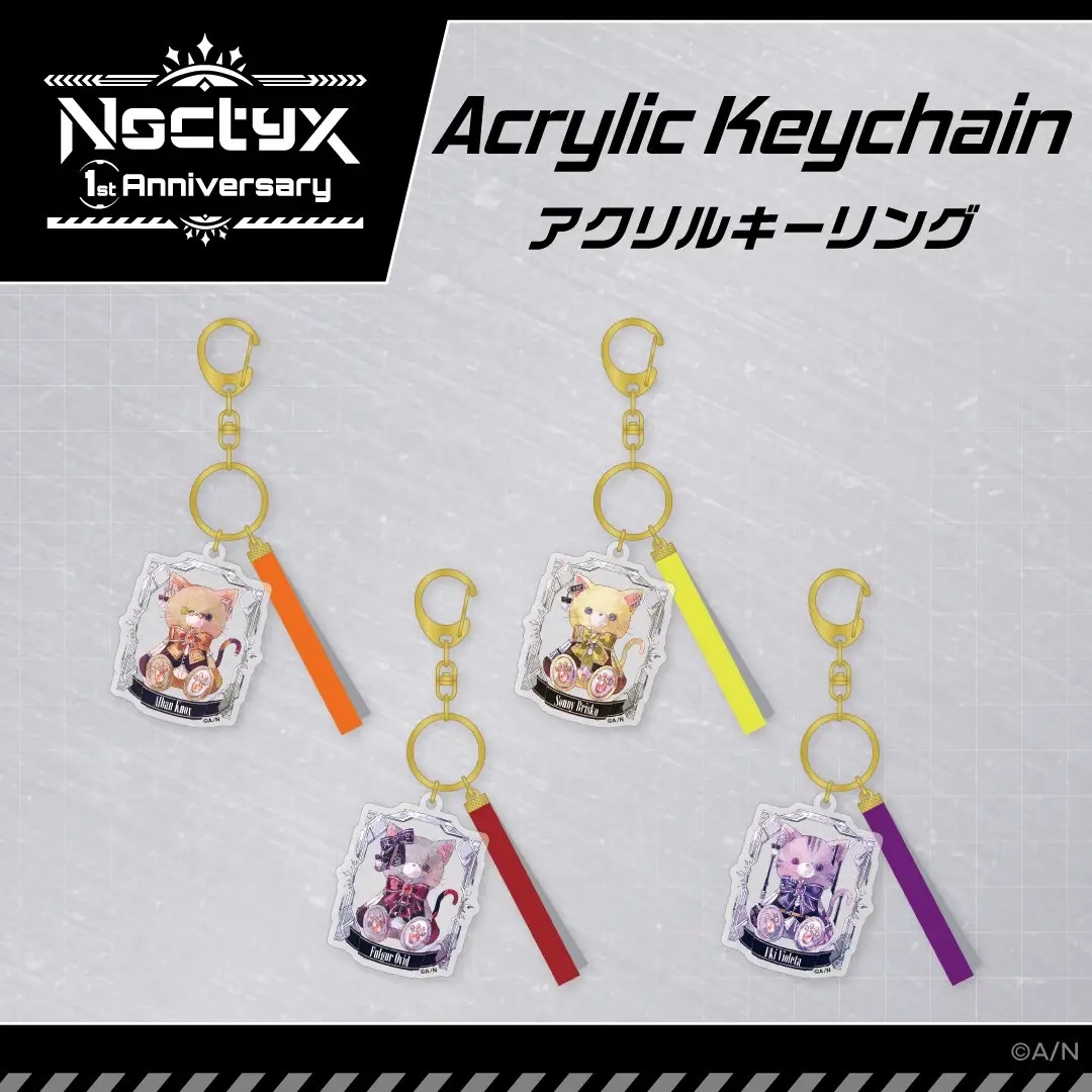 本次一週年紀念商品邀請到插畫家「黒野ユウ」繪製主視覺圖,小物設計由「Spin」負責,商品陣容包含壓克力立牌、徽章、隨身小包、手鍊等等,如果透過官方商店購買超過 3,000 日圓(含稅),就會獲得隨機一張 Noctyx 成員特典留言卡。
