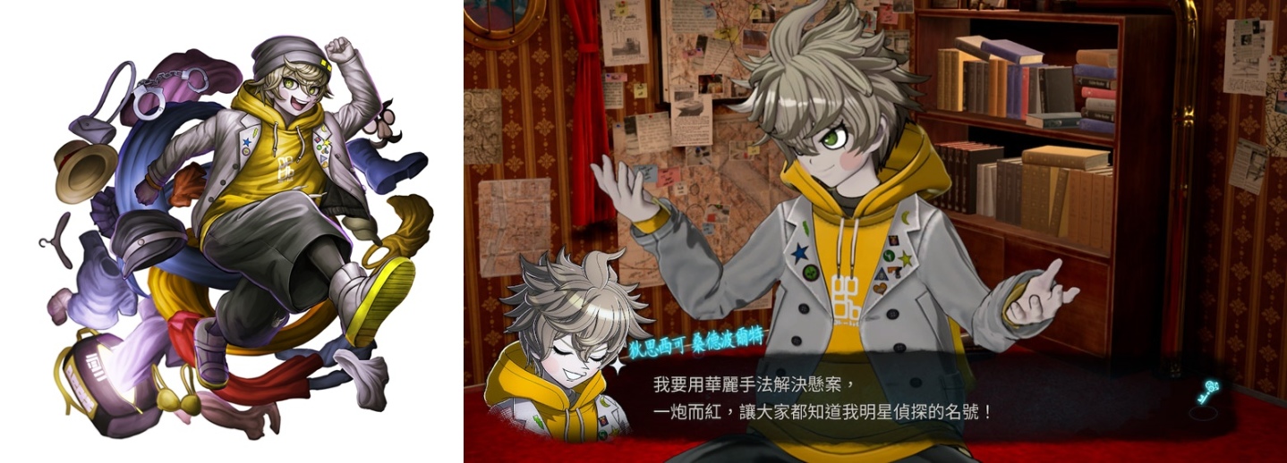 個性樂觀、愛好女色,總是藉著調查的名義到處搭訕。以明星偵探自居,想解決事件讓自己聲名大噪。身後背著巨大的後背包,裡面裝滿了變裝所需的道具。