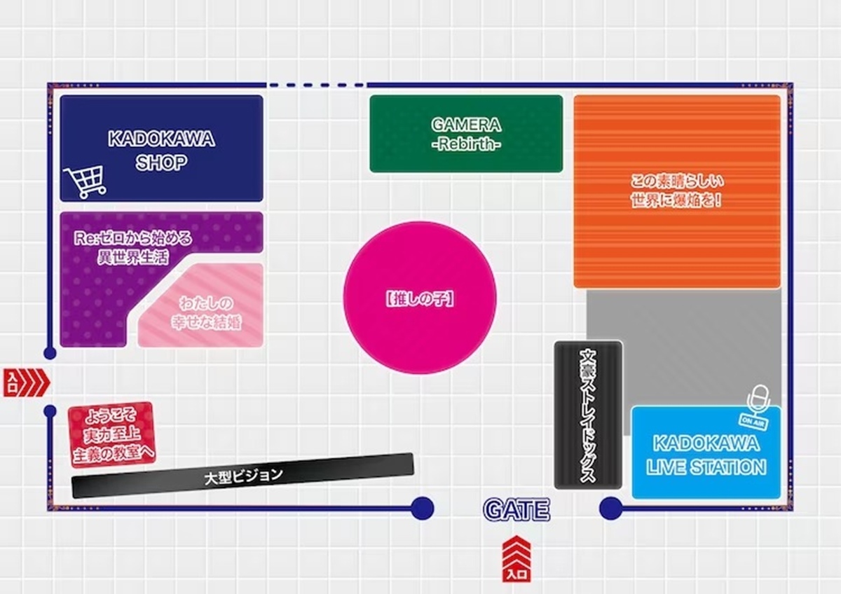 視覺圖中以遊樂園主題為核心概念呈現「KADOKAWA ANIME PARK」興奮不已的感覺,攤位內將有《【我推的孩子】》、《卡美拉 -Rebirth-》,《為美好的世界獻上爆焰!》、《文豪 Stary Dogs》、《歡迎來到實力至上主義的教室》、《Re:從零開始的異世界生活》、《我的幸福結婚》等七個作品的特別展示。