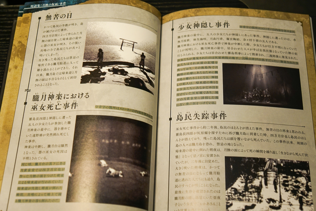 官方設定資料集「朧月島追想錄」收錄了所有登場角色的設定,角色關係,使用道具、與本作相關的神秘事件,麻生教授的研究書等豐富官方資料,還有特別撰寫的前傳小說內容。