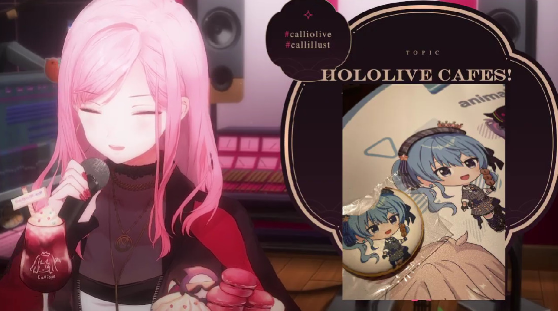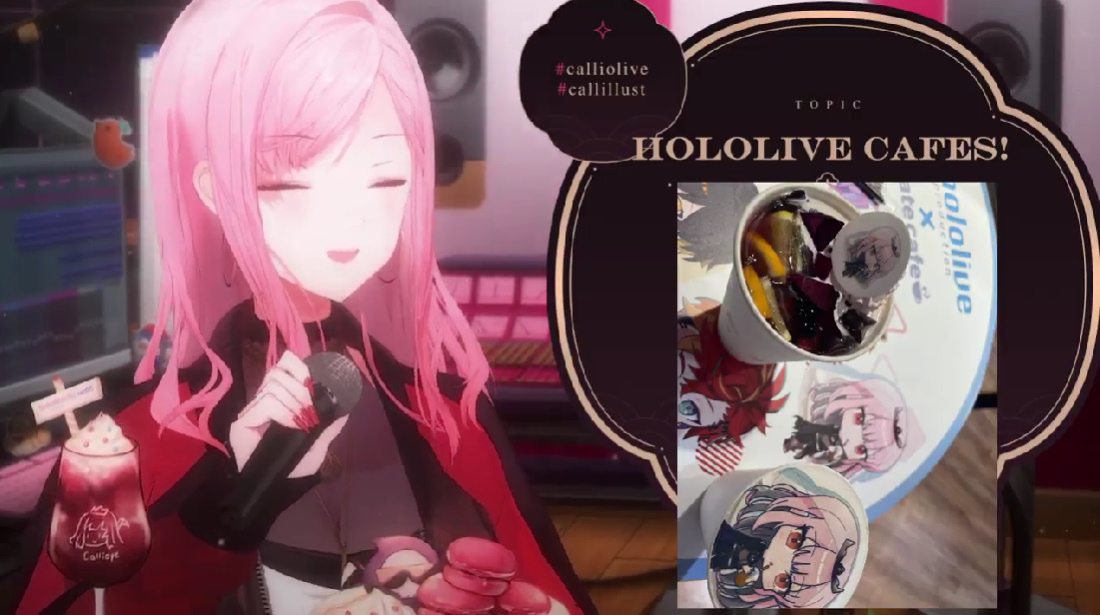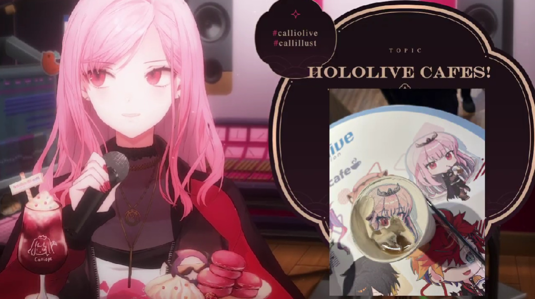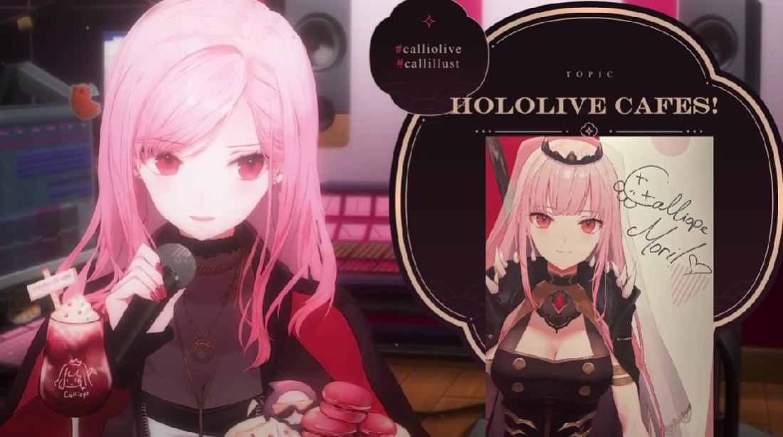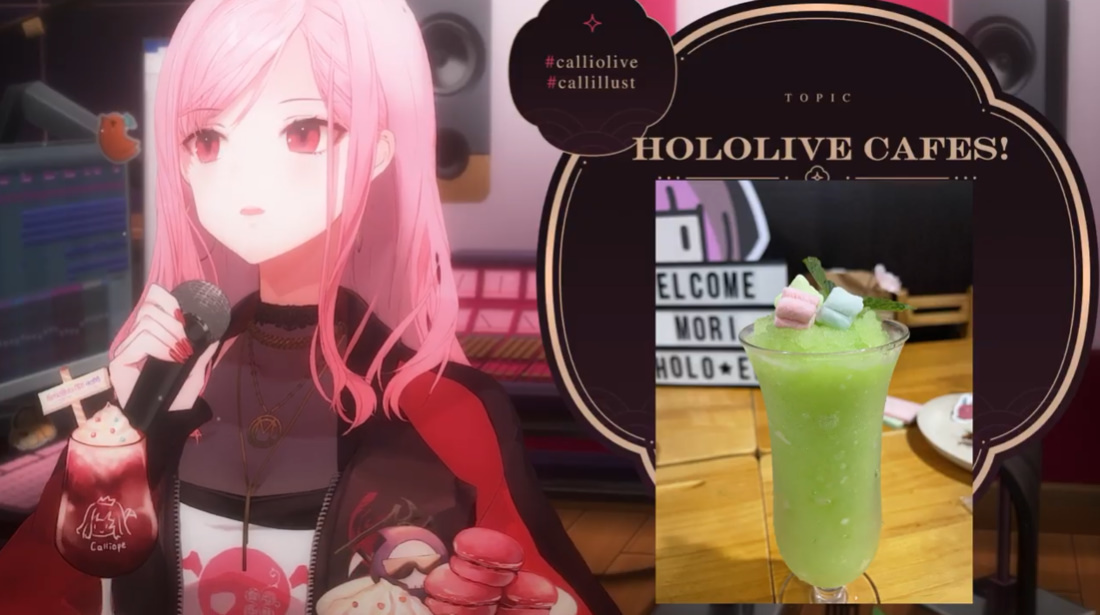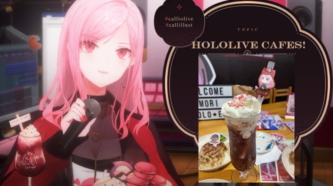直播中森美聲先講到在安利美特聯名咖啡的心得,包含店內的擺設和以 hololive 成員為主題的專區布置,也享用了印有自己圖樣的印刷飲品,並吃了印有星街前輩的糖霜餅乾,而她不僅在立牌上留下簽名,也特地簽在簽名板上,近期粉絲們如果有去安利美特咖啡朝聖的話都可以自由拍照。