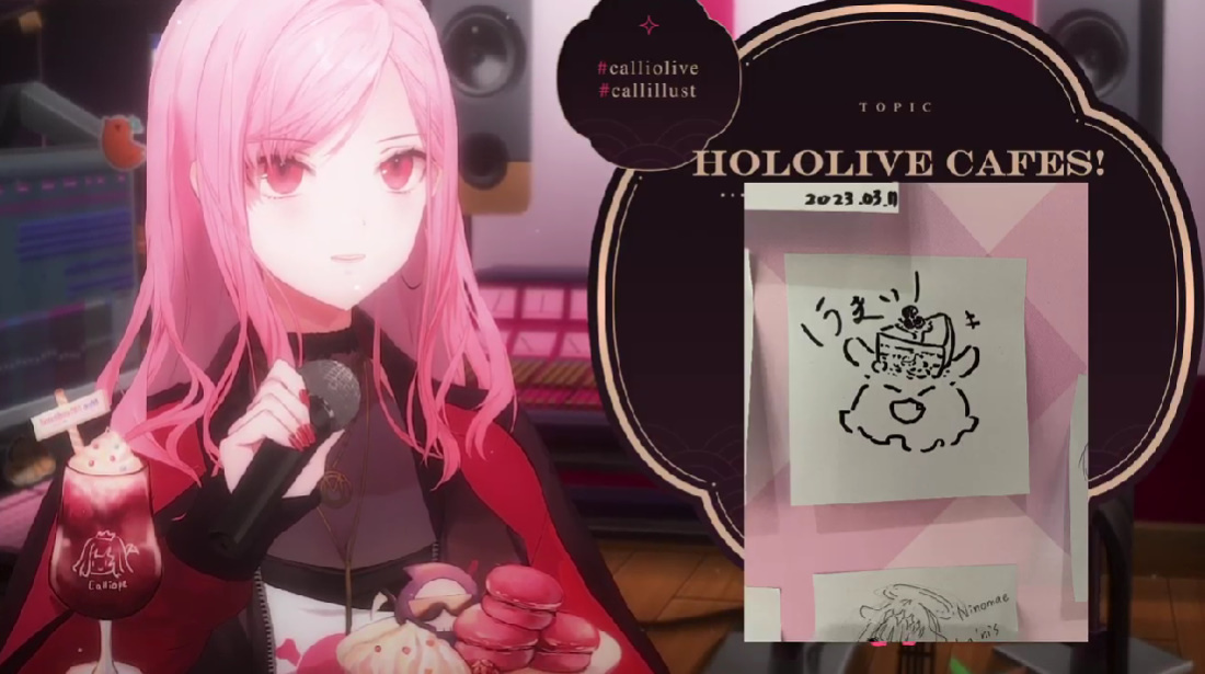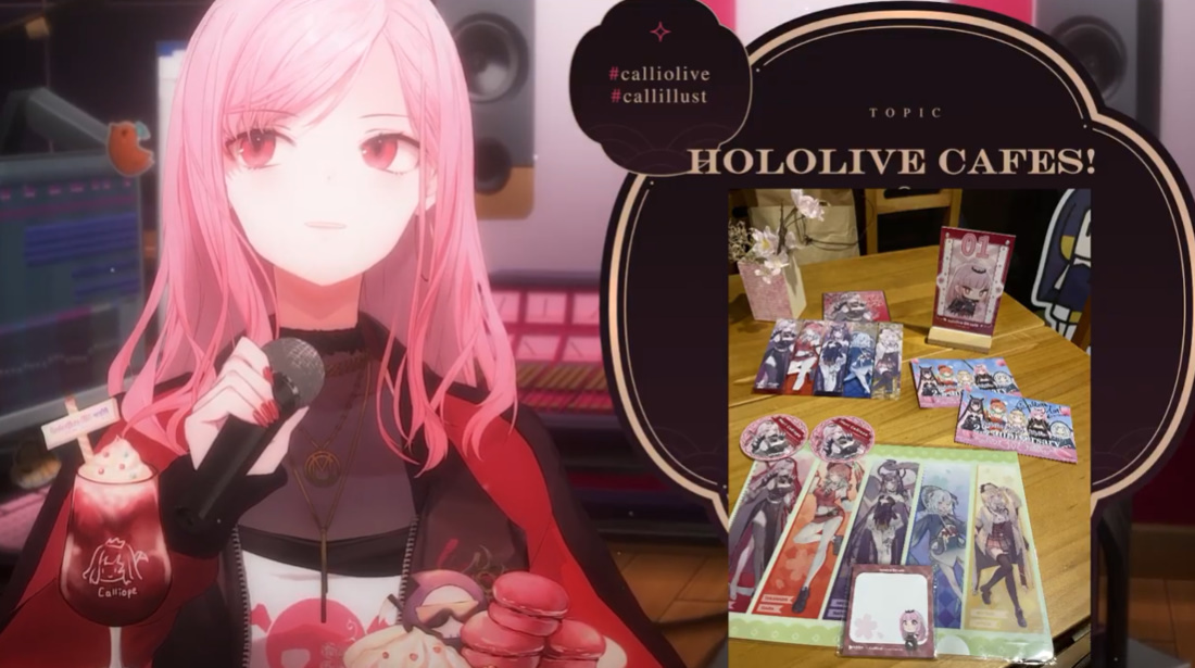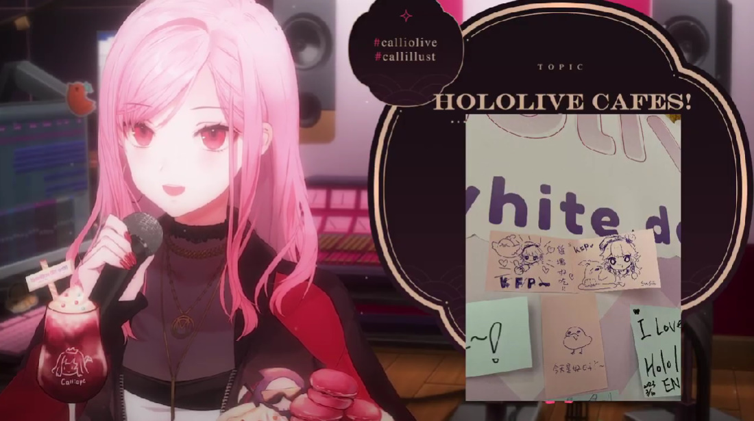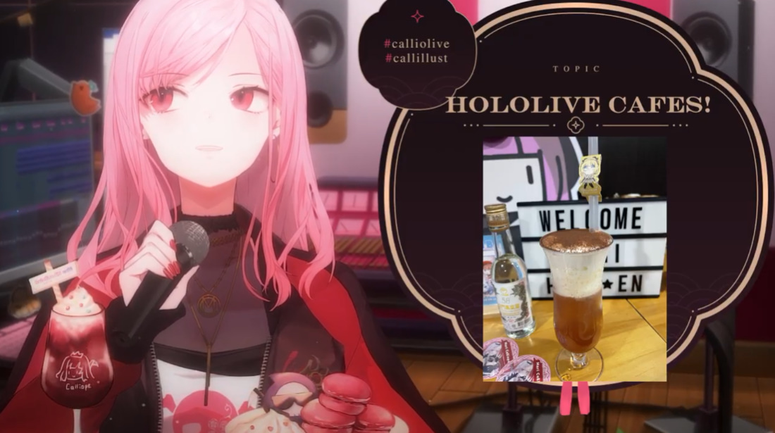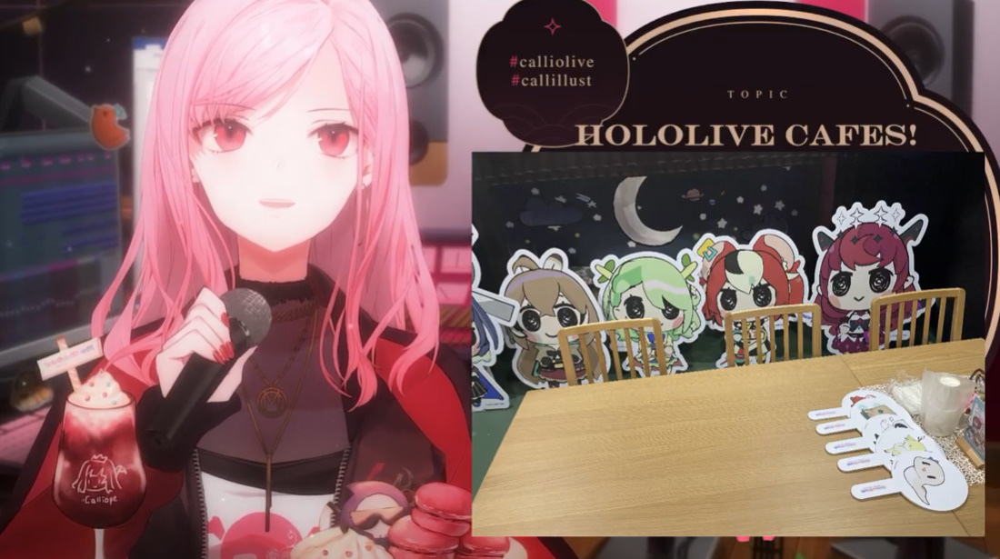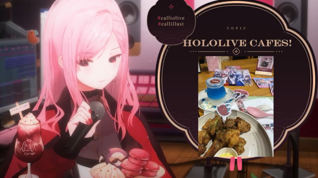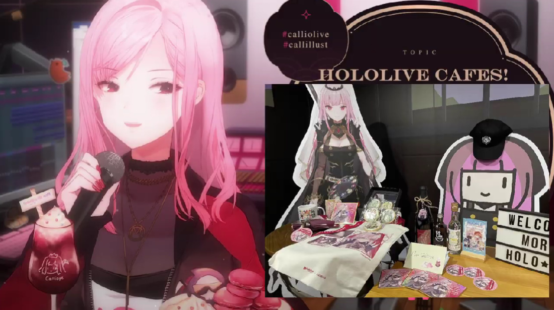直播中森美聲先講到在安利美特聯名咖啡的心得,包含店內的擺設和以 hololive 成員為主題的專區布置,也享用了印有自己圖樣的印刷飲品,並吃了印有星街前輩的糖霜餅乾,而她不僅在立牌上留下簽名,也特地簽在簽名板上,近期粉絲們如果有去安利美特咖啡朝聖的話都可以自由拍照。