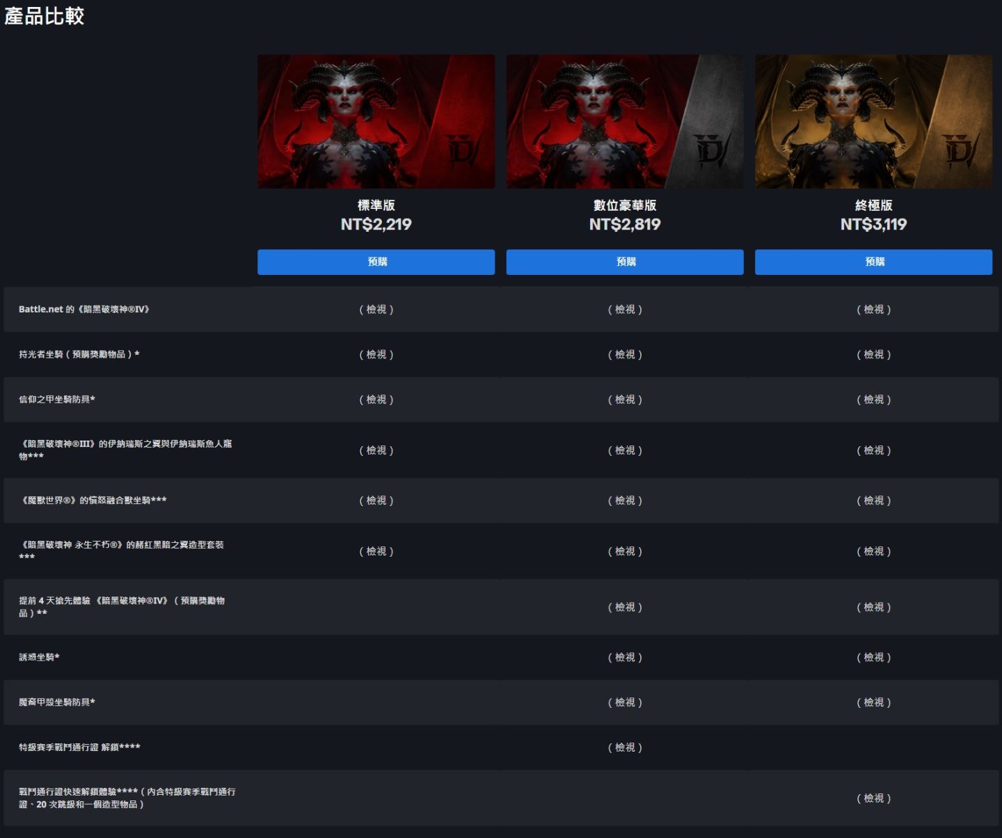 《暗黑破壞神4》標準版 NT2,219,數位豪華版 NT2,819,終極版 NT3,119,具體差異細項可在官方購買頁面查詢。較明顯差異為豪華與終極版可在正式上市時提前 4 天遊玩,以及解鎖首次特級賽季戰鬥通行證。