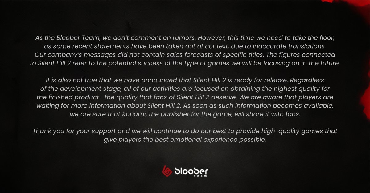 而 Bloober Team 則發出公告駁斥這些謠言,貼文中表示傳言來自於不精確的翻譯,他們也未曾宣布《沉默之丘2 重製版》已製作完成,無論開發階段如何,他們都致力於讓產品達到更高的品質。如果有最新消息,開發商 Konami 絕對會與粉絲們分享。