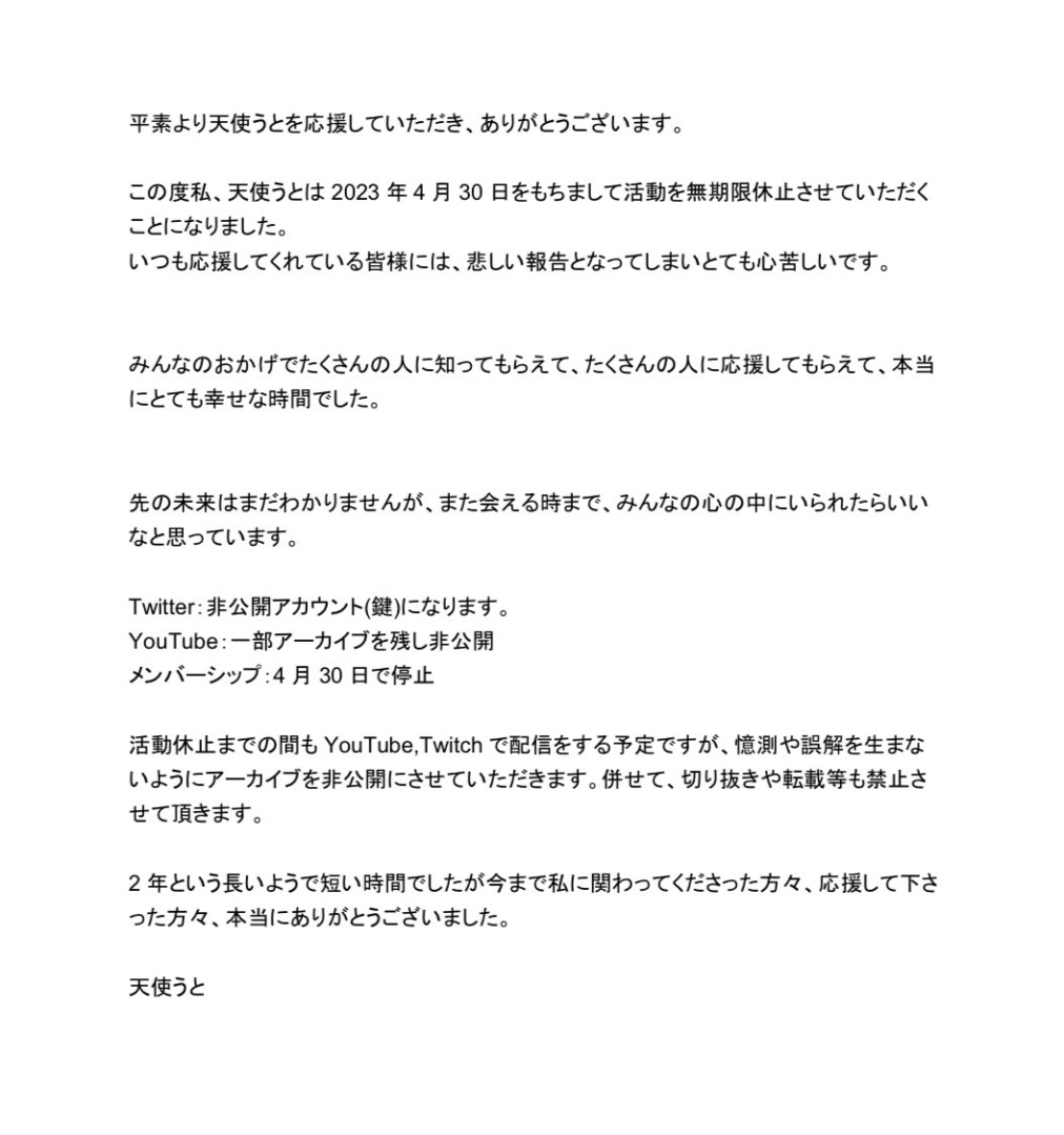 對於無限期暫停活動的決定天使うと表示要向大家表達這件難過的事情非常不容易,但她不知道未來會怎樣,希望自己能夠長存在粉絲心中直到再次相見的那天;她的 Youtube 會員也將在 4 月 30 日停止,在活動暫停前會持續在 Youtube 和 Twitch 直播,但直播檔會改為非公開以避免遭到猜疑和誤解,也不允許剪輯和轉載,並在文章最後感謝所有在這兩年多時間內支持與鼓勵她的所有人。