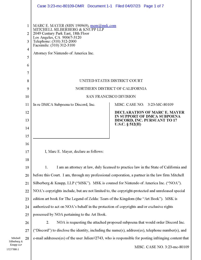 根據外媒 Torrentfreak 的報導,北美任天堂已經委任 MITCHELL SILBERBERG & KNUPP LLP 律師事務所,向加州北區聯邦地方法院舊金山分院提出傳票申請,要求 Discord 提供檔案散佈者的相關個資。