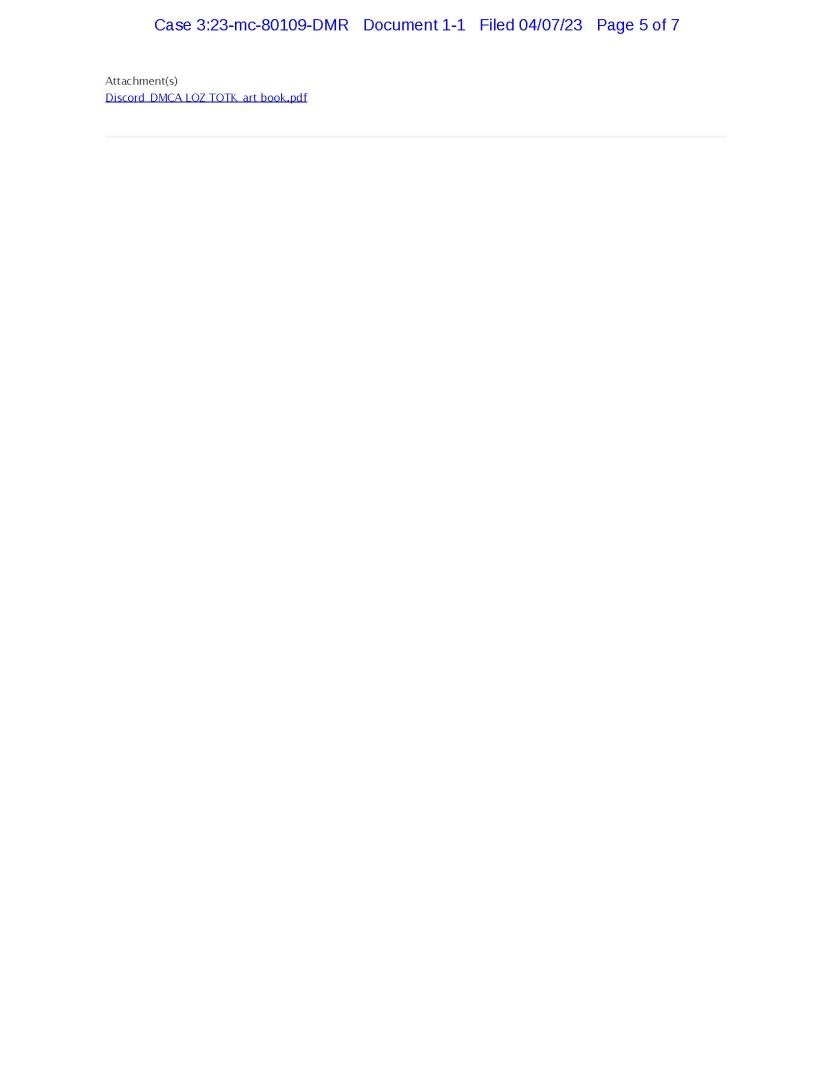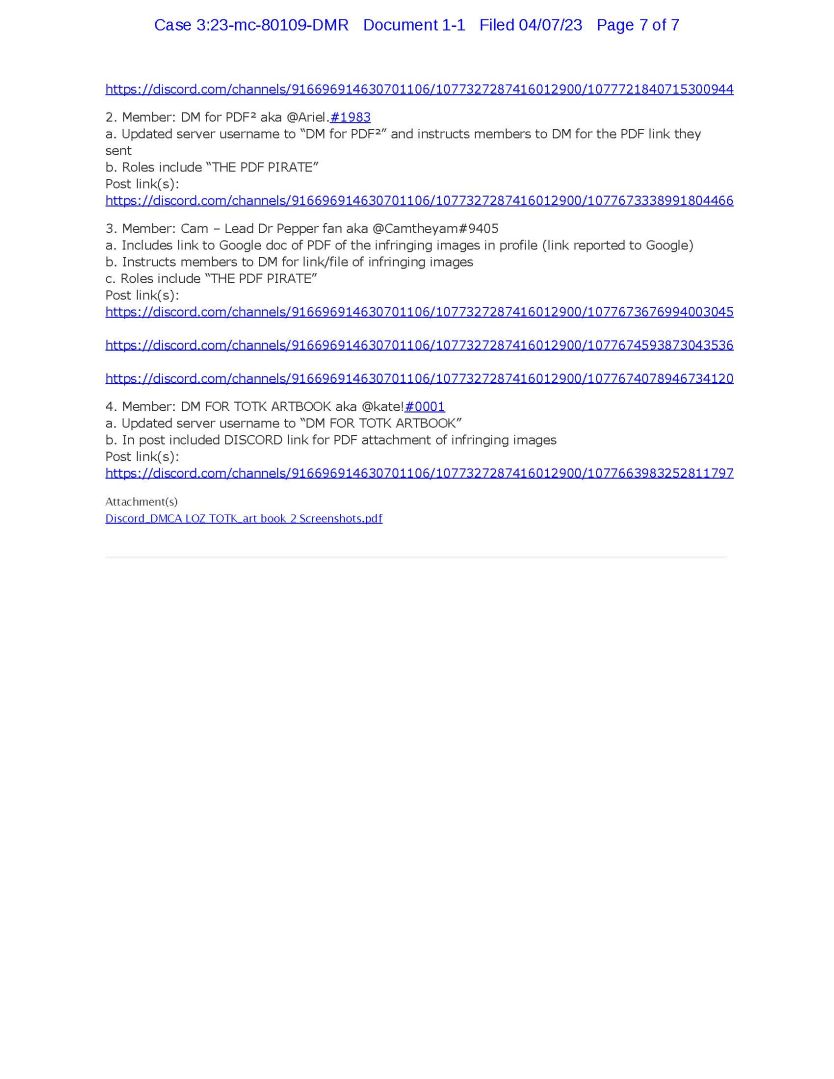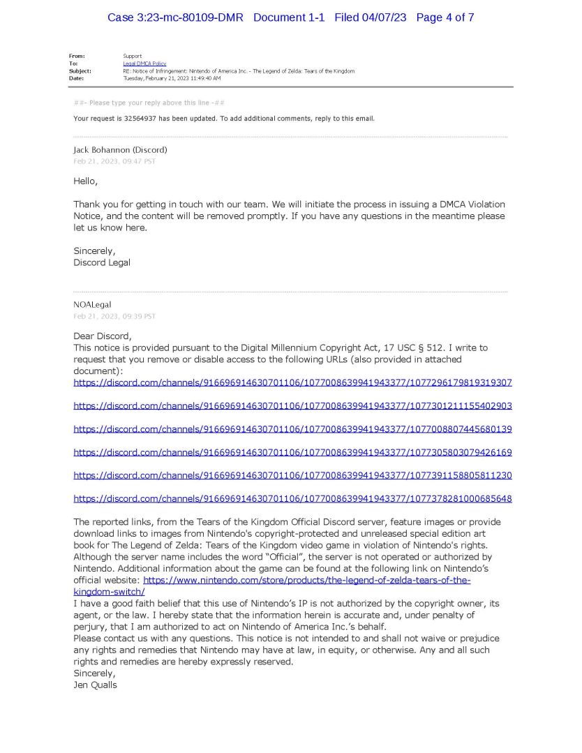 根據傳票文件裡的佐證內容,任天堂從 2 月 21 日開始發函給 Discord 提出版權聲明,要求 Discord 從伺服器中移除王國之淚原畫集的相關檔案,而 Discord 隨後也回覆表示已針對任天堂提出的要求對相關伺服器發出警告。