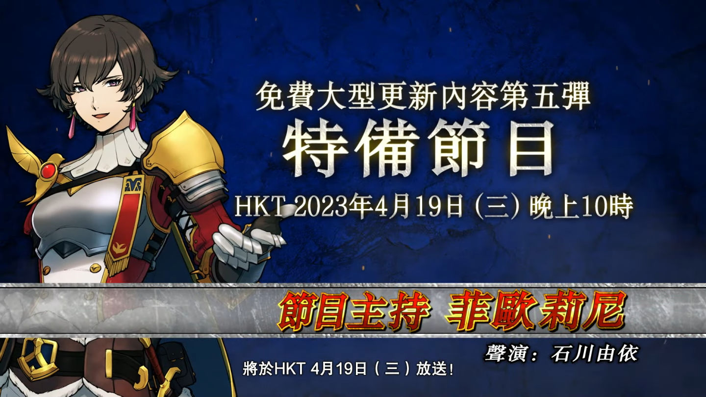 由聲演王國騎士「菲歐莉尼」的聲優石川由衣將於台灣 / 香港時間 4 月 19 日(三)晚上 10 時的預錄直播中擔任主持人,公開預定於 2023 年 4 月下旬之後上線的「免費更新內容第五彈(Ver.15)」最新宣傳片及發布日期等資訊,公佈回歸的古龍種魔物、系統更新等,及各平台版本更新路線圖。