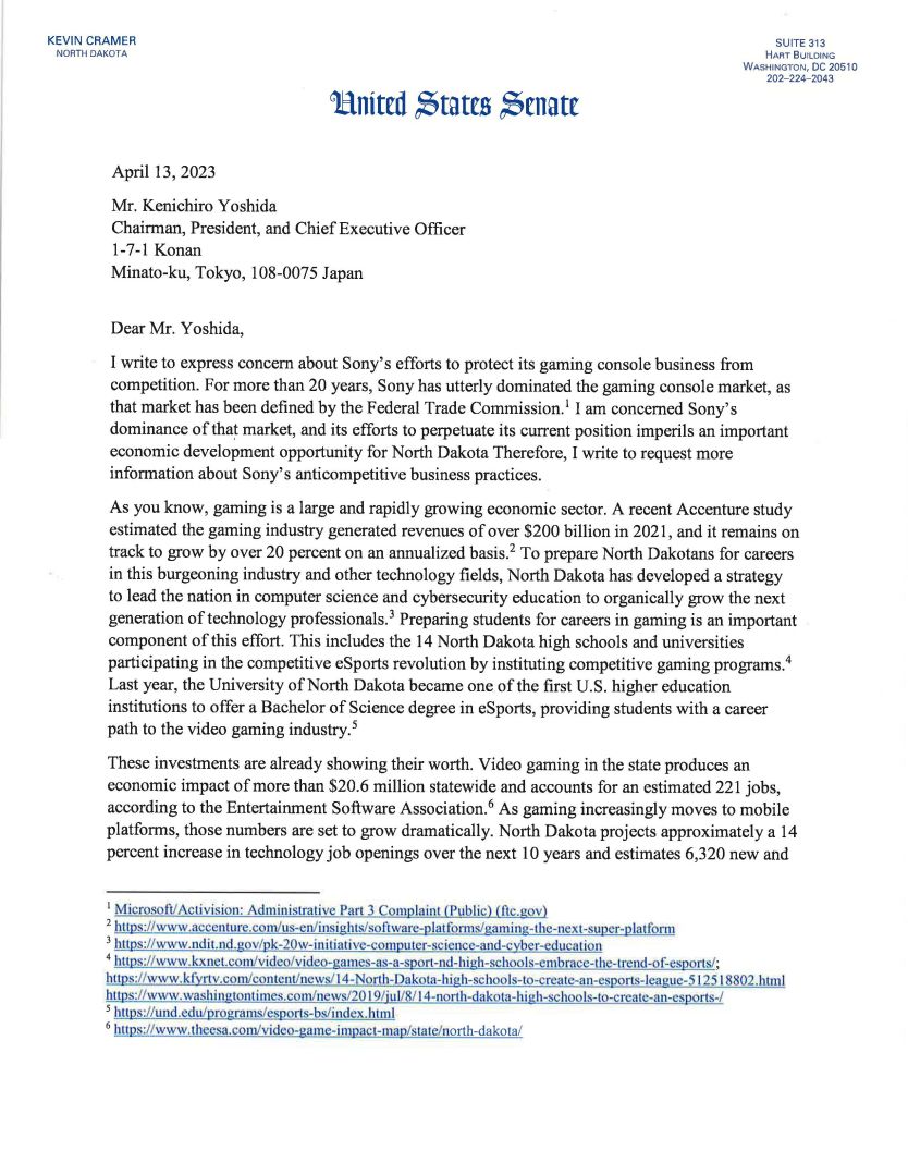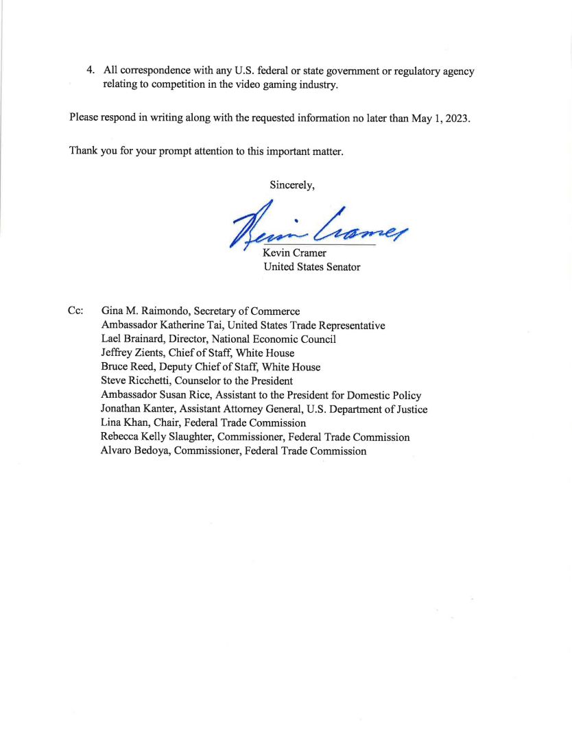 繼 11 位國會議員要求美國政府對微軟 XBOX 主機在日本市場受到的不公平競爭採取行動,以及 FTC 美國聯邦交易委員會要求索尼提供獨佔合約文件後,近日另一位議員 Kevin Cramer 更是直接發函給日本索尼執行長吉田憲一郎,要求索尼提供更多完整獨佔遊戲合約,以及收購 Bungie 工作室的所有相關文件。