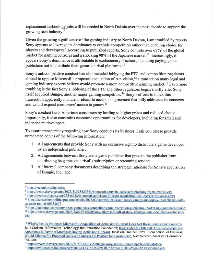 Cramer 議員在信件中強調,北達科塔大學是美國首批提供電競相關學程與學士學位的大學之一。而索尼已經稱霸家用主機市場超過二十年(任天堂:蛤?),因為擔心索尼的行為會傷害北達科塔州的遊戲相關就業市場,才特別發函要求索尼提供相關文件資料。
