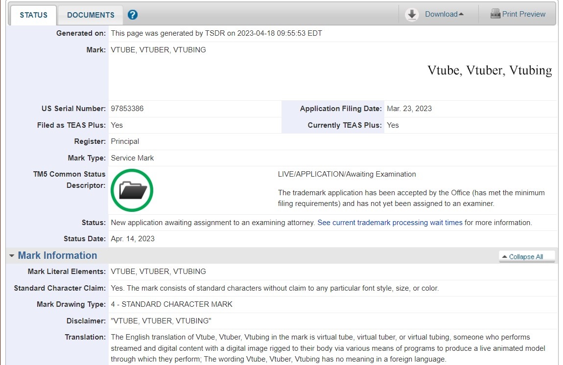 根據 USPTO 官網資料公布的消息,這些詞彙的商標申請是由美國紐澤西州紐華克市的居民 Mota Vincent K 所提出的,他聲稱這些詞彙是在 2009 年的時候就創造,比世界上公認第一位 Vtuber 絆愛誕生的 2016 年還早了許多,意指「個人使用帶有動作追蹤或操縱的虛擬化身(不限於動畫風格)並進行表演的娛樂類別」,該申請於今年 3 月 23 日提交,於 4 月 14 日狀態顯示為正在等待該局的審查。