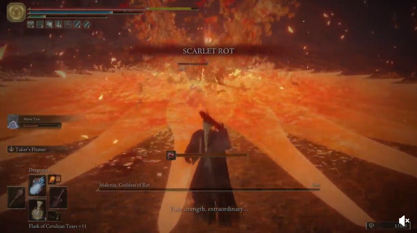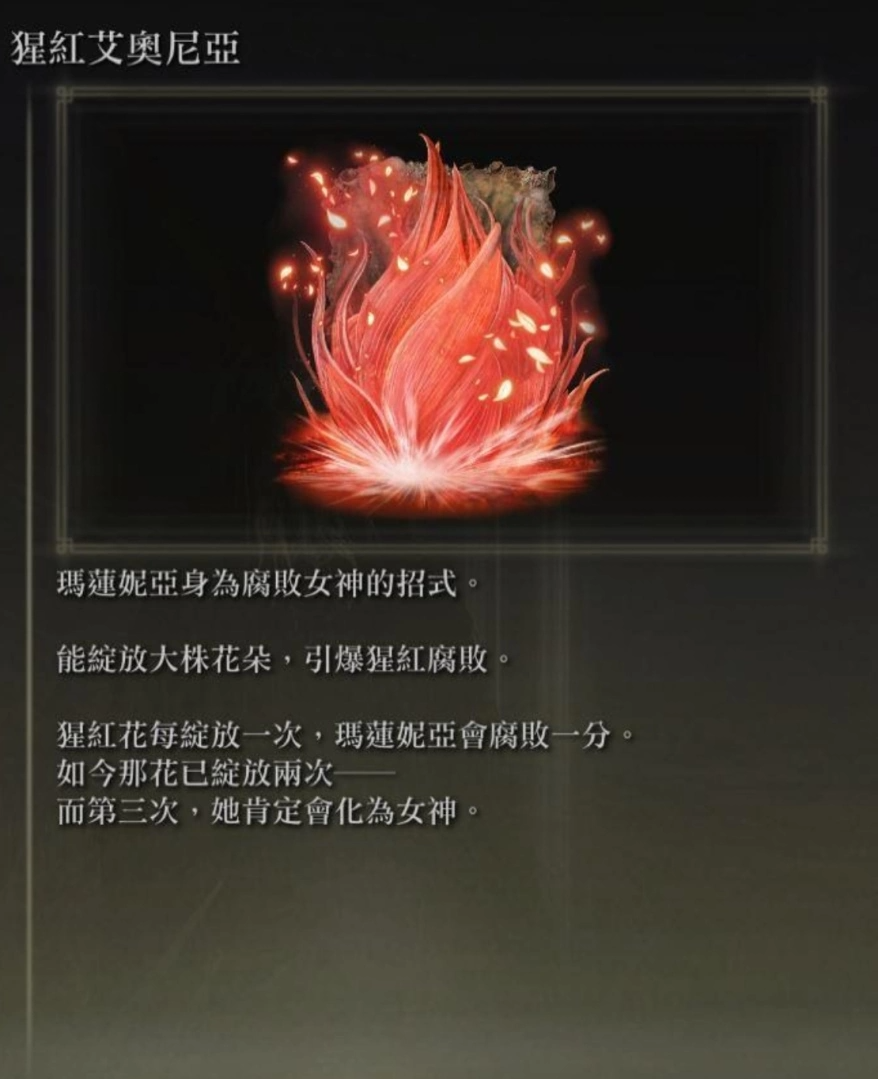 「猩紅艾奧尼亞」本身就是有故事的招式,瑪蓮妮亞不斷對抗著腐敗侵蝕,而「猩紅艾奧尼亞」則是讓她引導出腐敗力量的攻擊招式,每使用一次便會加深侵蝕,三次後將受影響成為腐敗女神。先前已使用過兩次的她,在遇到玩家被逼到下個階段時,便會玉石俱焚使出這一招,玩家所對付的最終型態即為已成為腐敗女神的瑪蓮妮亞。