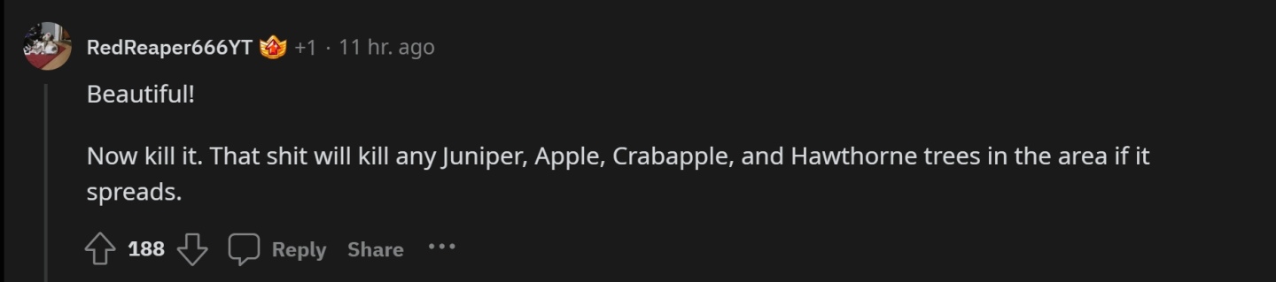 不過最近在 reddit 上有玩家分享了更神似的植物,美洲蘋果銹病菌。不但外觀上極為神似,正如其名,美洲蘋果銹病菌並非是一種花,而是菌類病原體,會寄生在蘋果樹或紅柏、柑橘等樹木上並腐蝕植物,最終造成植物死亡,也完全符合猩紅腐敗對女武神瑪蓮妮亞造成的影響。