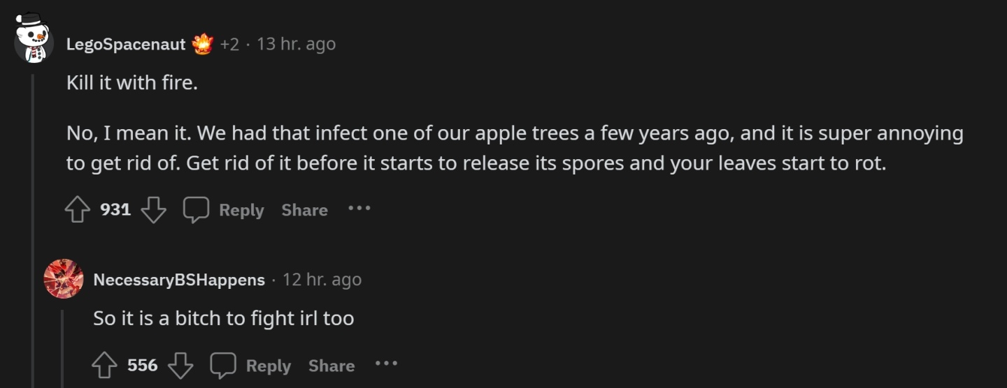 原作者開玩笑說有人在他家後院打倒了瑪蓮妮亞,其它玩家立即分享自身經驗:立刻放火燒掉。「我是認真的,放任它成長散發孢子會害所有蘋果樹染病」,「很美,但請立刻殺了它,擴散後附近的樹都會被害死」。