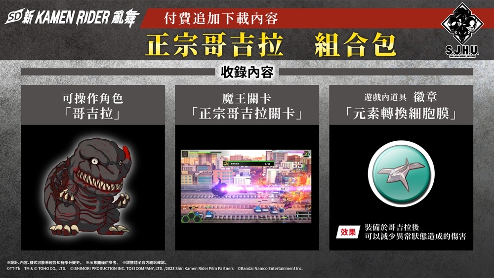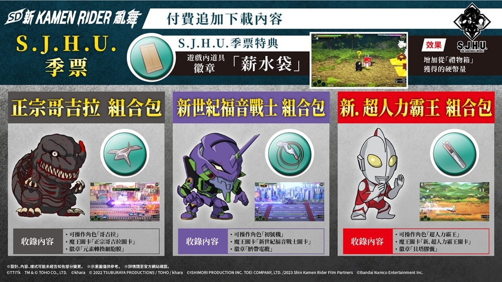 包含可操作角色「初號機」、「超人力霸王」及「哥吉拉」的付費追加DLC「S.J.H.U.季票」已於今日正式發售。單獨收錄各可操作角色的DLC組合包亦將於日後陸續發布,敬請期待。