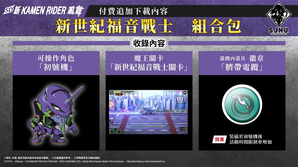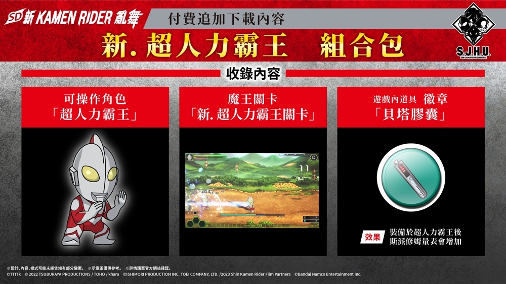 「新.日本英雄宇宙」(S.J.H.U.)將作為付費追加 DLC 集結於此,「初號機」、「超人力霸王」及「哥吉拉」化身 SD 角色華麗戰鬥。