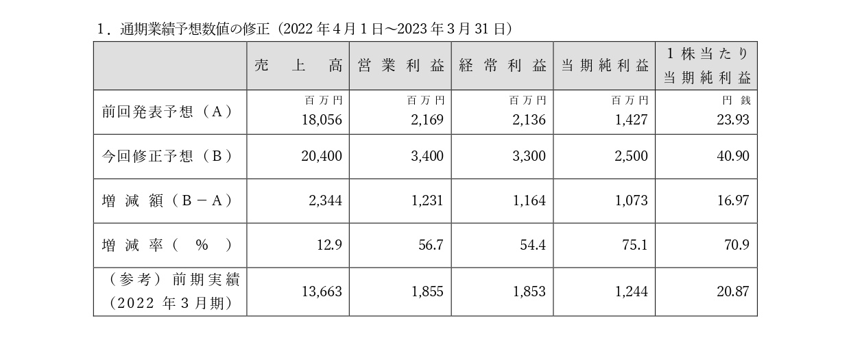 因此與整年度的預算相比,整體銷售額從 180 億上修到 204 億,營業利益預計比預算增加 12.31 億來到 34 億,淨收益預期金額從 14 億 2700 萬日圓修改為 25 億,基於上述原因決定上修業績預測。
