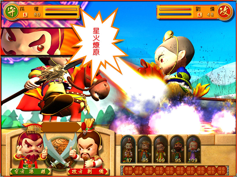 戰鬥模式則增強了錦囊的效果,讓文官角色比前作更加重要。文將可使出「扮豬吃虎」強迫對手交過路費、單挑時使用「互通有無」換取敵方武器,或是能改變地形的「種木成林」;還有「孟女哭城」讓瞬間摧毀敵方城池耐久度!