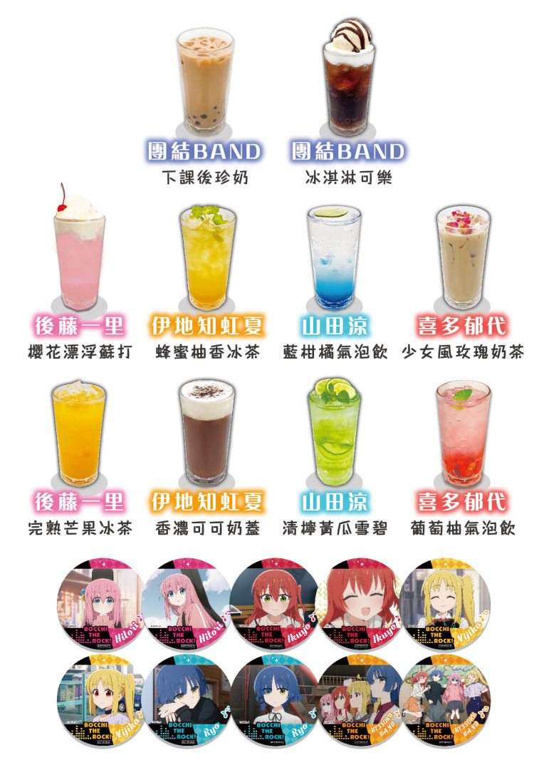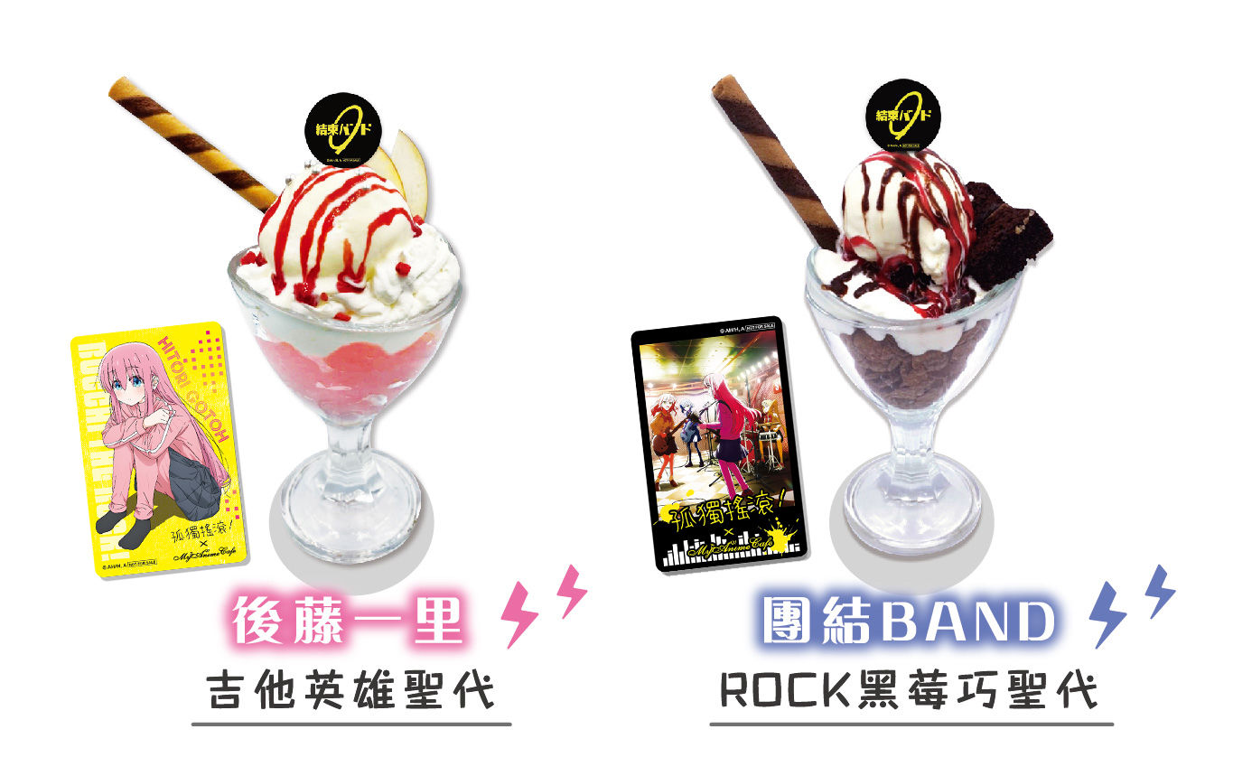 《孤獨搖滾!》主題 Café 餐點以四位角色:後藤一里、伊知地虹夏、山田涼、喜多郁代規劃,包含各式特色主餐、甜點、飲料,特別推薦後藤一里主餐「融化的粉紅咖哩」,全力呈現化為一灘的意象!針對日漸轉熱的季節,活動期間也推出代表後藤一里的吉他英雄聖代及團結 BAND 的 ROCK 黑莓巧聖代,讓你口口沁涼入心。每道主題餐點均為精心設計,不可錯過!