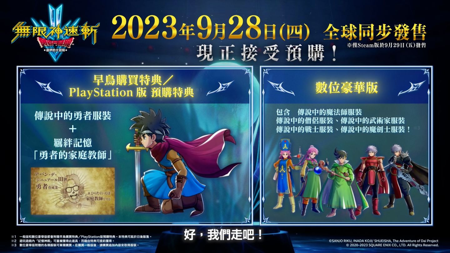 日本 Square Enix 預定 2023 年內在 PS5/PS4/Nintendo Switch/PC Steam 等平台上全球同步推出推出的動作 RPG《無限神速斬 勇者鬥惡龍 達伊的大冒險》(インフィニティストラッシュ ドラゴンクエスト ダイの大冒険),宣布家機版將於 2023 年 9 月 28 日全球同步發售、Steam 版將於 9 月 29 日推出,並將針對各平台下載版依次開放預購。