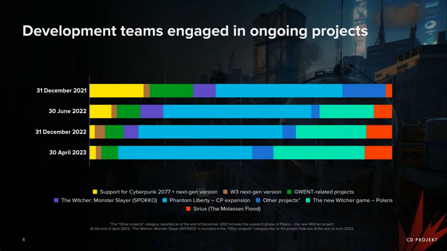 作為《巫師》IP 未來和新三部曲遊戲起步,北極星計畫將以 Unureal Engine 5 開發,製作團隊自 2022 年 6 月以來一直穩步增長,並一直是 CDPR 開發第二大項目。而天狼星計劃雖然在三月時重新啟動,並因此讓 CDPR 燒掉近 3 億經費,該計劃自 2022 年初以來依然獲得許多資源開發。CDPR 並未對天狼星計劃透露太多重新啟動後的狀態與方向,但可以肯定該計劃依然持續執行開發中。